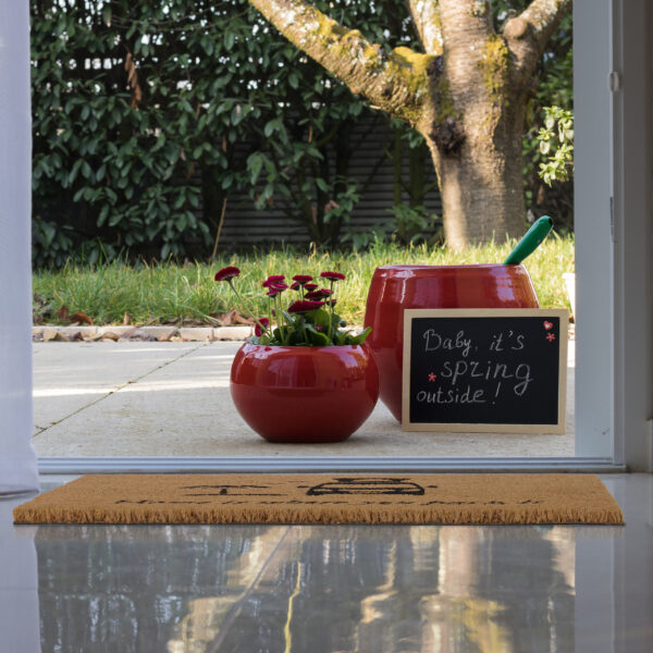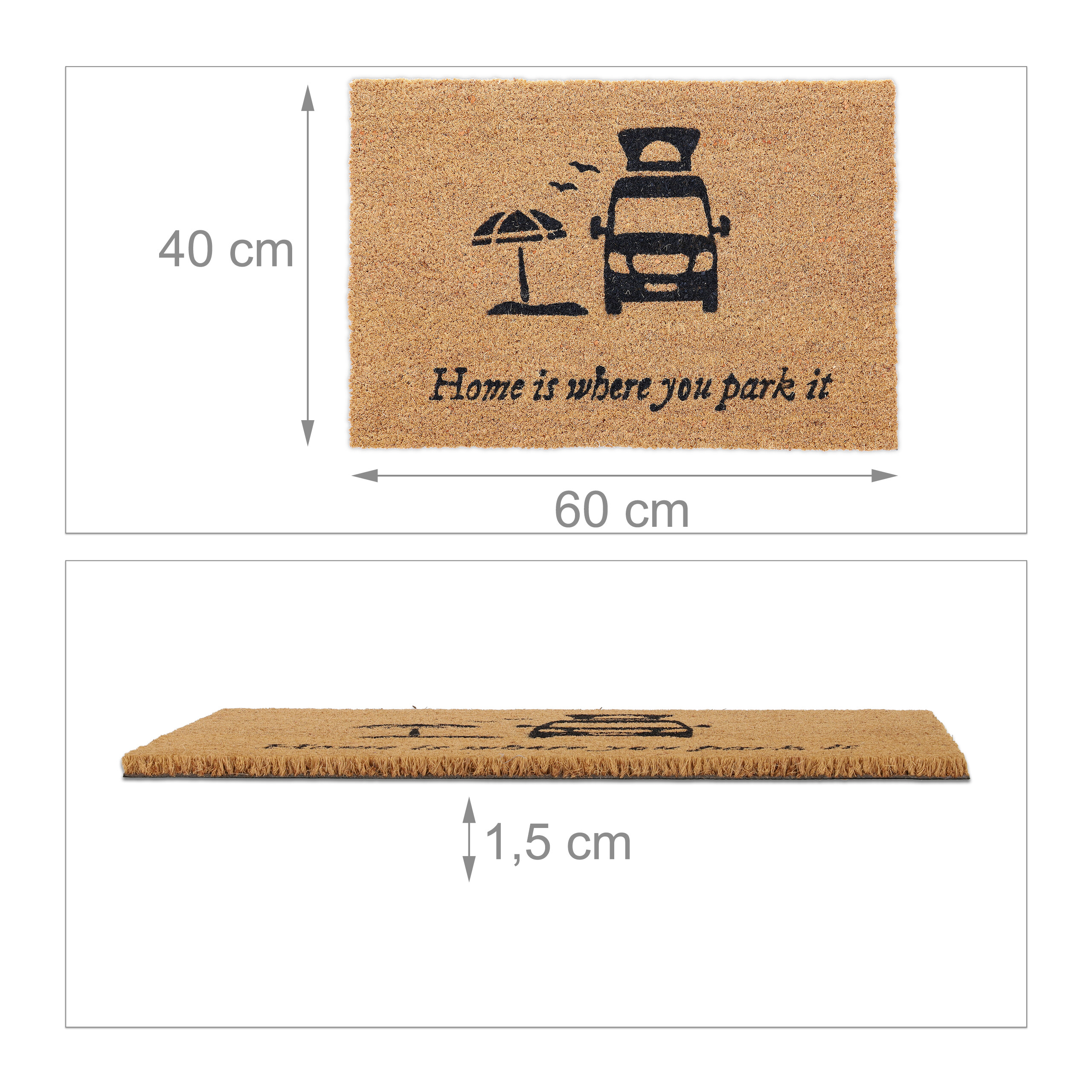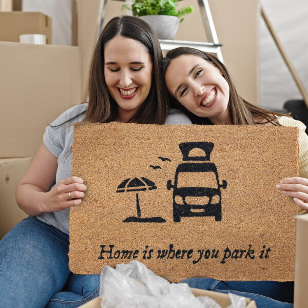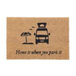 Durų kilimėlis „Home is where you park it” 60×40 cm., šviesiai rudos/juodos spalvos