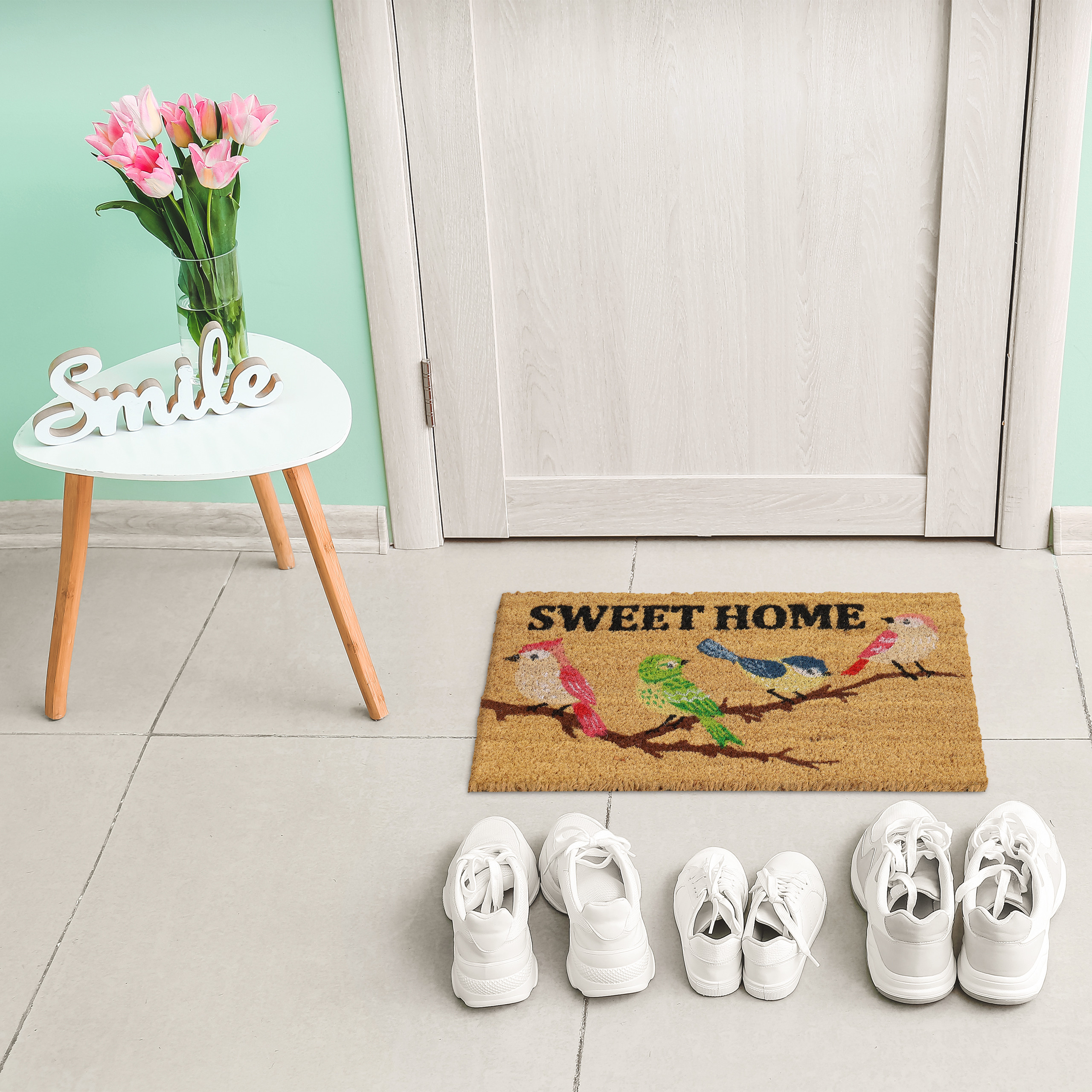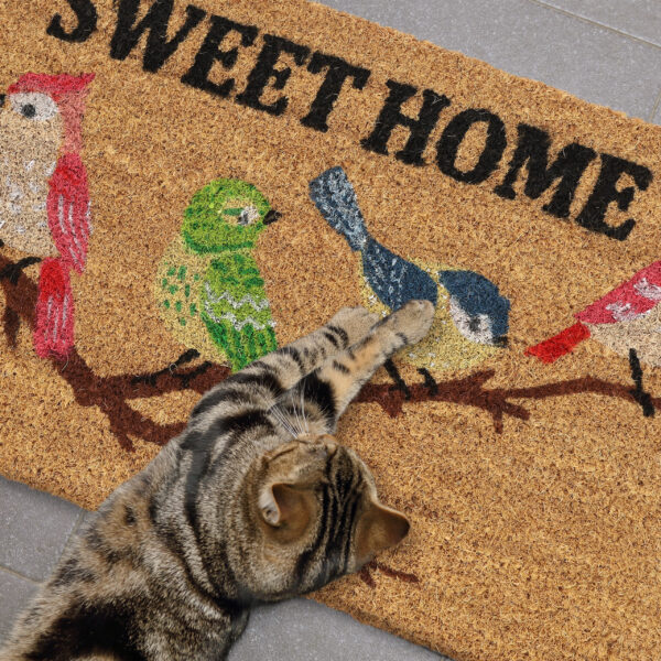 Pasitikite savo svečius su šiuo žavingu durų kilimėliu „Sweet Home”, kuris ne tik papuoš jūsų įėjimo zoną, bet ir suteiks jaukumo jausmą. Šis kilimėlis, dekoruotas spalvingais paukščiais ir užrašu, puikiai tiks bet kurioje aplinkoje, tiek viduje, tiek lauke.