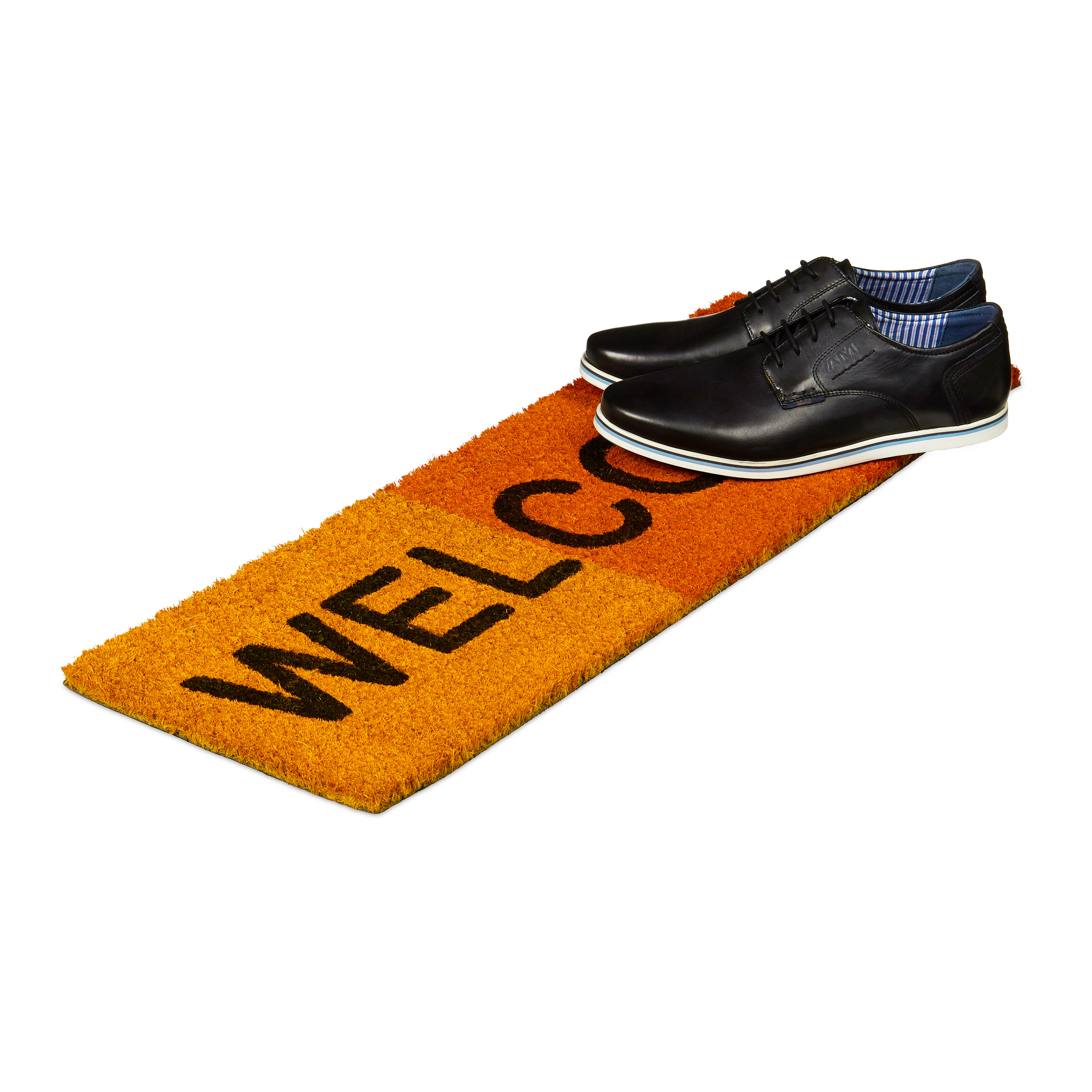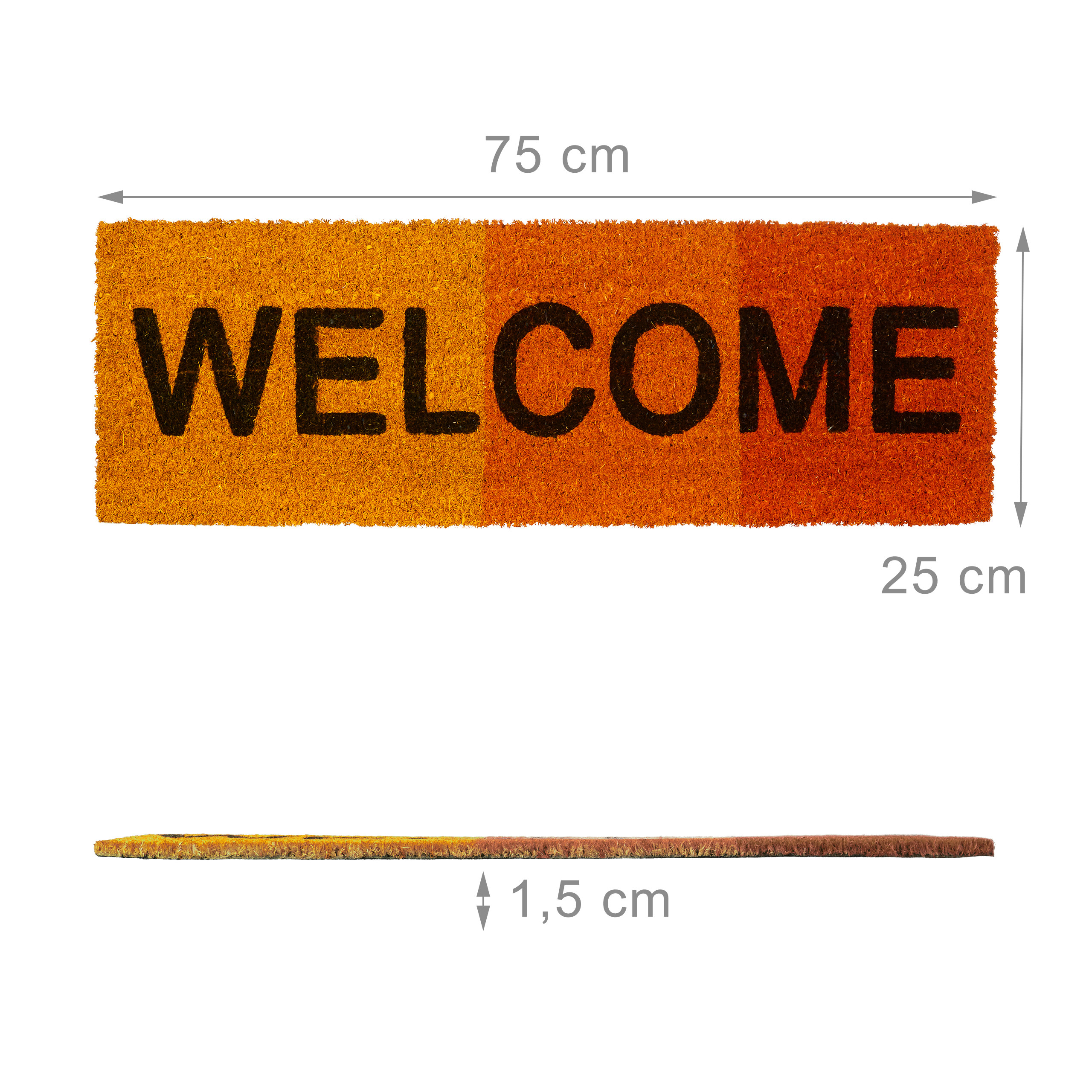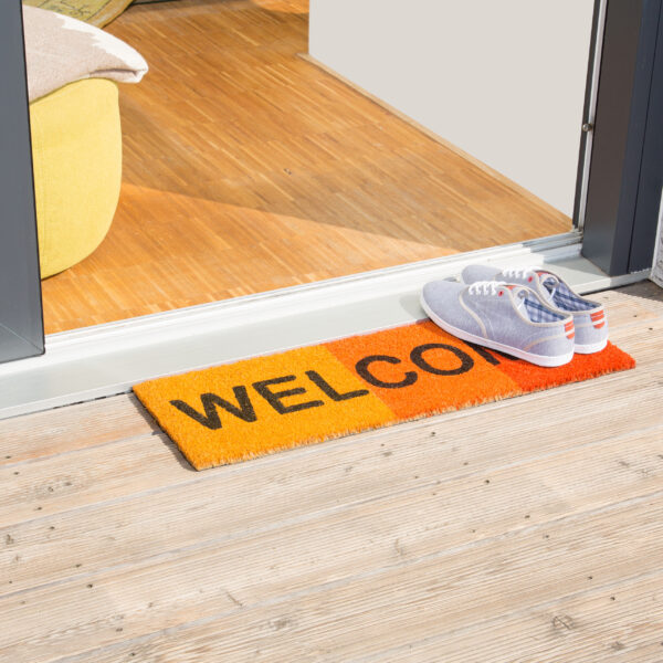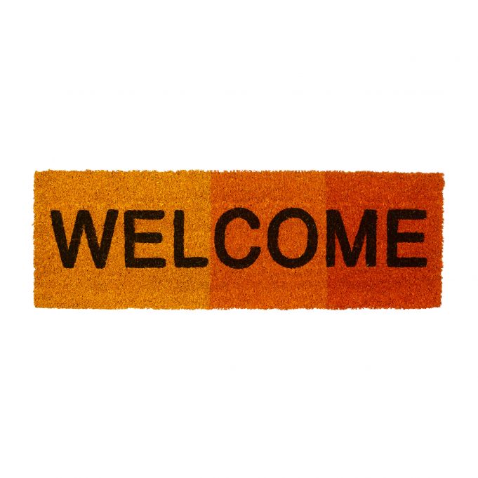 Kilimėlis pasižymi geltonos, oranžinės ir raudonos spalvų gradientu, kuris suteikia šilumos ir jaukumo jūsų namų aplinkai. Užrašas „Sveiki atvykę“ ne tik maloniai pasitiks jūsų svečius, bet ir pridės žavesio jūsų įėjimui.