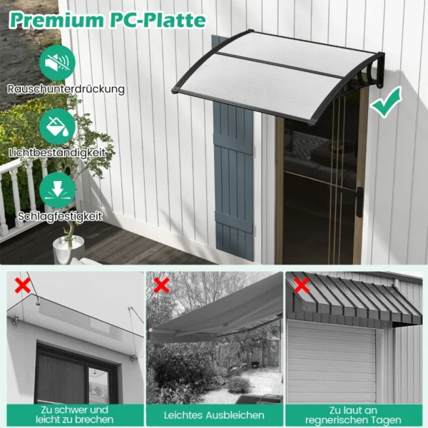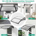 Durų stogelis 122x99x28cm, juodos spalvos, suteikia patikimą apsaugą nuo įvairių oro sąlygų jūsų durims ir langams. Šis polikarbonatinis baldakimas apsaugo nuo lietaus, sniego ir saulės spindulių, padeda išlaikyti įėjimą sausą bei saugo patalpų vidų nuo vandens pažeidimų. Lengvas montavimas ir universalus pritaikymas daro šį stogelį praktišku sprendimu namų bei verslo aplinkose.