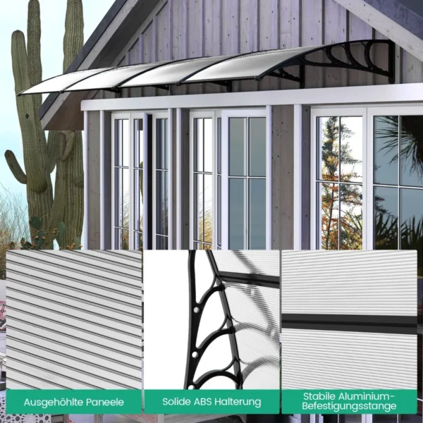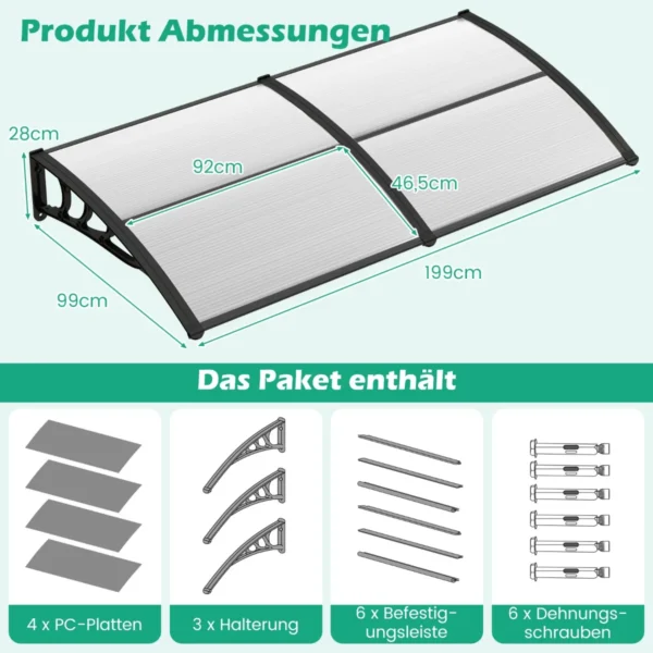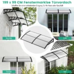 Durų stogelis 199x99x28cm juodos spalvos suteikia patikimą apsaugą nuo oro sąlygų ir leidžia palaikyti švarų bei sausą įėjimą. Šis polikarbonatinis baldakimas apsaugo langus ir duris nuo lietaus, sniego bei saulės spindulių, užtikrinant ilgalaikį naudojimą lauke.