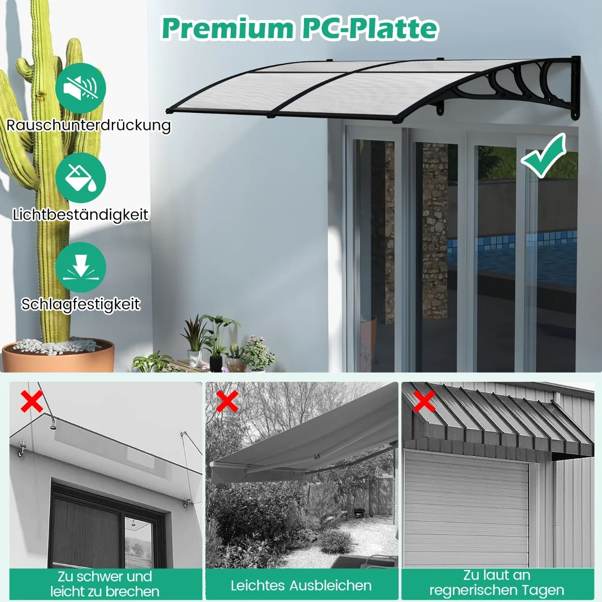 • Durų stogelis 199 x 99 cm dydžio, tinka montuoti ant įvairių sienų paviršių.
