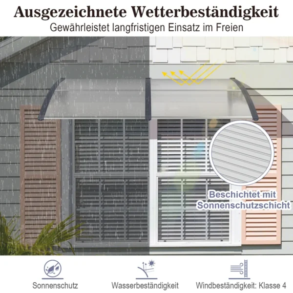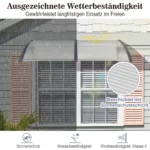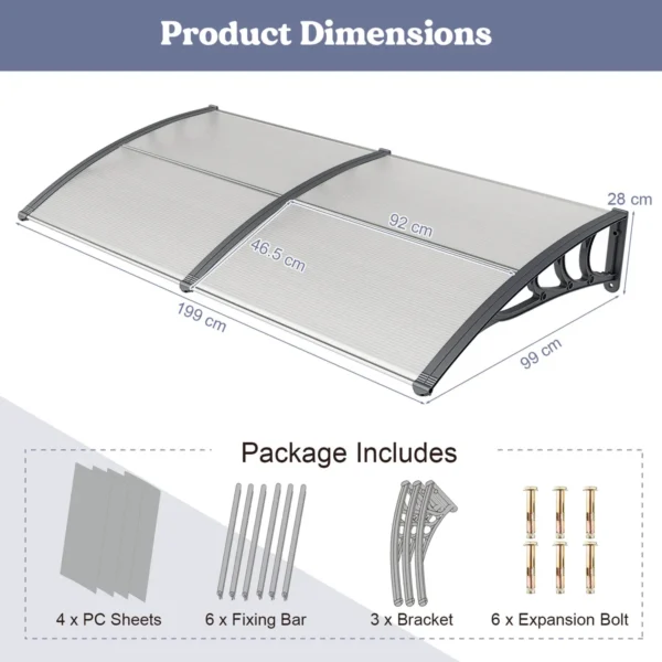 Durų stogelis 199x99x28cm tamsiai pilkos spalvos yra skirtas apsaugoti duris ir langus nuo lietaus, sniego ir saulės spindulių. Šis polikarbonato stogelis padeda išlaikyti įėjimą sausą ir apsaugo nuo vandens pažeidimų, tuo pačiu užtikrindamas atsparumą įvairioms oro sąlygoms.