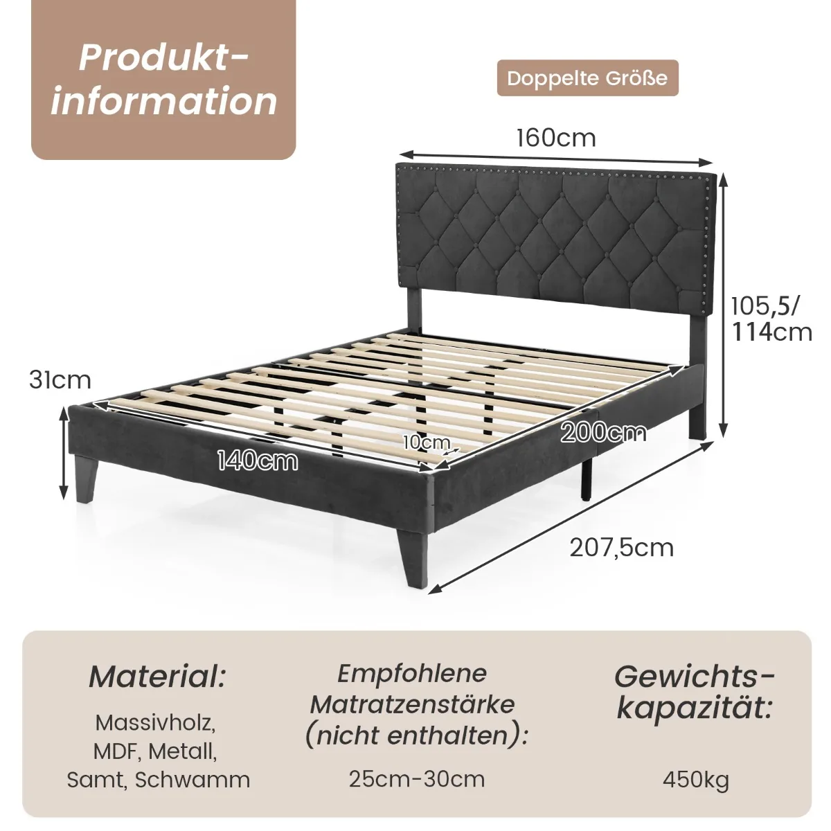 Dvigulės lovos rėmas 207,5x160x114 cm tamsiai pilkos spalvos yra patvarus ir stabilus sprendimas miegamajam. Pagamintas iš medžio masyvo juostų su minkštu aksomo galvūgaliu, jis užtikrina patogumą ir ilgaamžiškumą kasdieniam naudojimui.