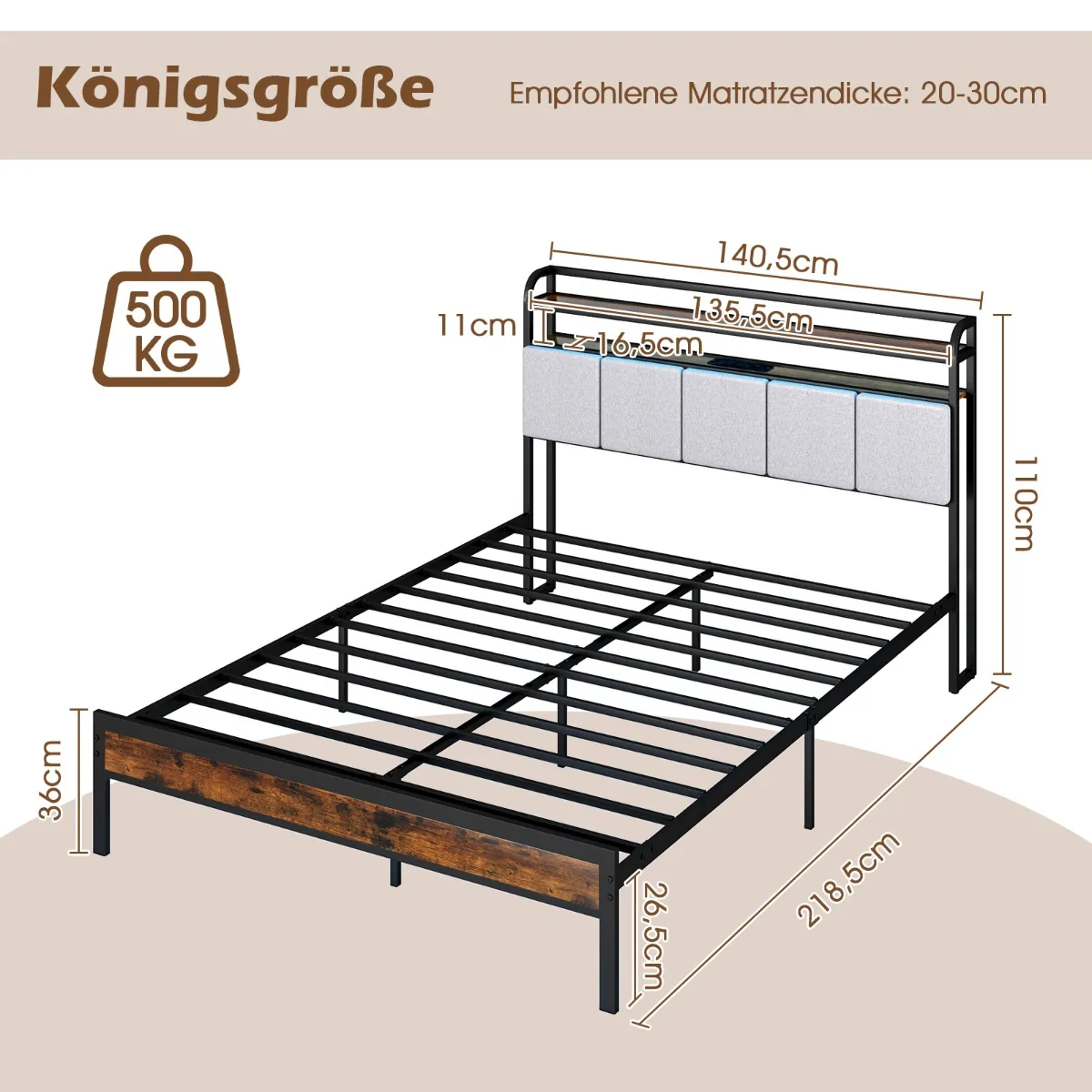 Dvigulės lovos rėmas 218,5×140,5x110cm juodos ir rudos spalvos suteikia patikimą pagrindą ir funkcionalumą miegamojo erdvei. Integruotas LED apšvietimas su reguliuojamomis spalvomis ir ryškumu leidžia sukurti tinkamą atmosferą poilsiui. Metalinė konstrukcija užtikrina stabilumą ir ilgaamžiškumą.