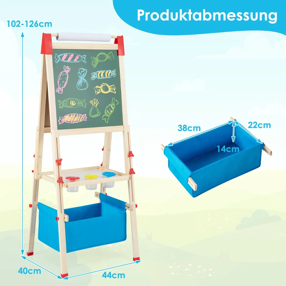 Dvipusė piešimo lenta 44x40x126cm įvairių spalvų – tai universali vaikiška lenta, skirta 3–8 metų vaikų kūrybai ir piešimo įgūdžių ugdymui. Reguliuojamas aukštis ir daugybė priedų leidžia pritaikyti molbertą pagal mažųjų poreikius.
