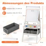 Dvipusė piešimo lenta 54x46x101,5 cm yra universali vaikiška priemonė kūrybiškumui skatinti. Šis molbertas skirtas vaikams nuo 3 iki 6 metų ir suteikia įvairias piešimo bei mokymosi galimybes su magnetine lenta, tradicine lenta ir popieriaus ritiniu. Tai praktiškas sprendimas lavinti vaikų piešimo, rašymo ir motorikos įgūdžius.