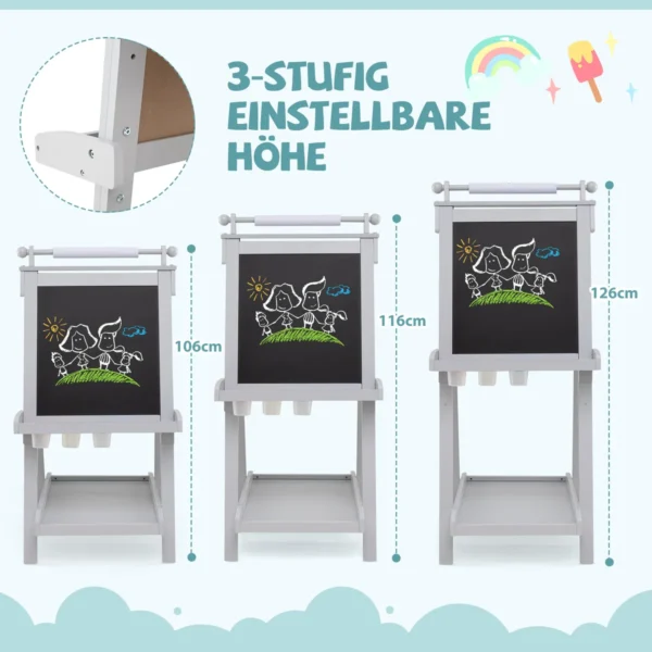 - Molberto aukštis reguliuojamas trimis lygiais (106 cm, 116 cm, 126 cm), prisitaikantis prie vaiko amžiaus.