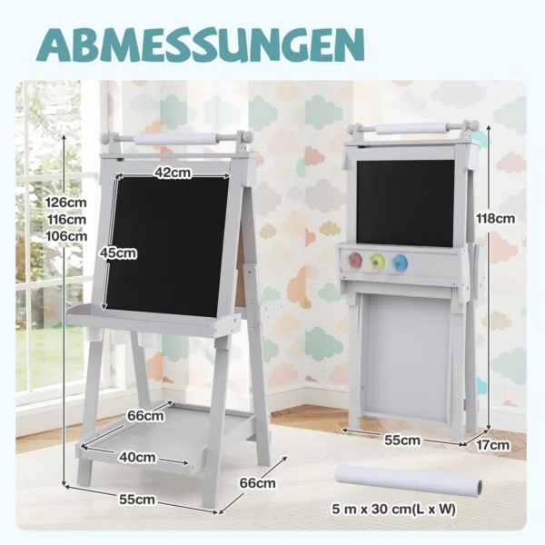 Dvipusė piešimo lenta 55x66x126cm., įvairių spalvų – tai funkcionalus ir patogus vaikiškas molbertas, skirtas kūrybiškumui lavinti. Ši lenta suteikia galimybę piešti ant klasikinės ir magnetinės lentos bei naudoti keičiamą popieriaus ritinį. Reguliuojamas aukštis ir daug vietos meno reikmenims užtikrina ilgalaikį naudojimą bei tvarką.