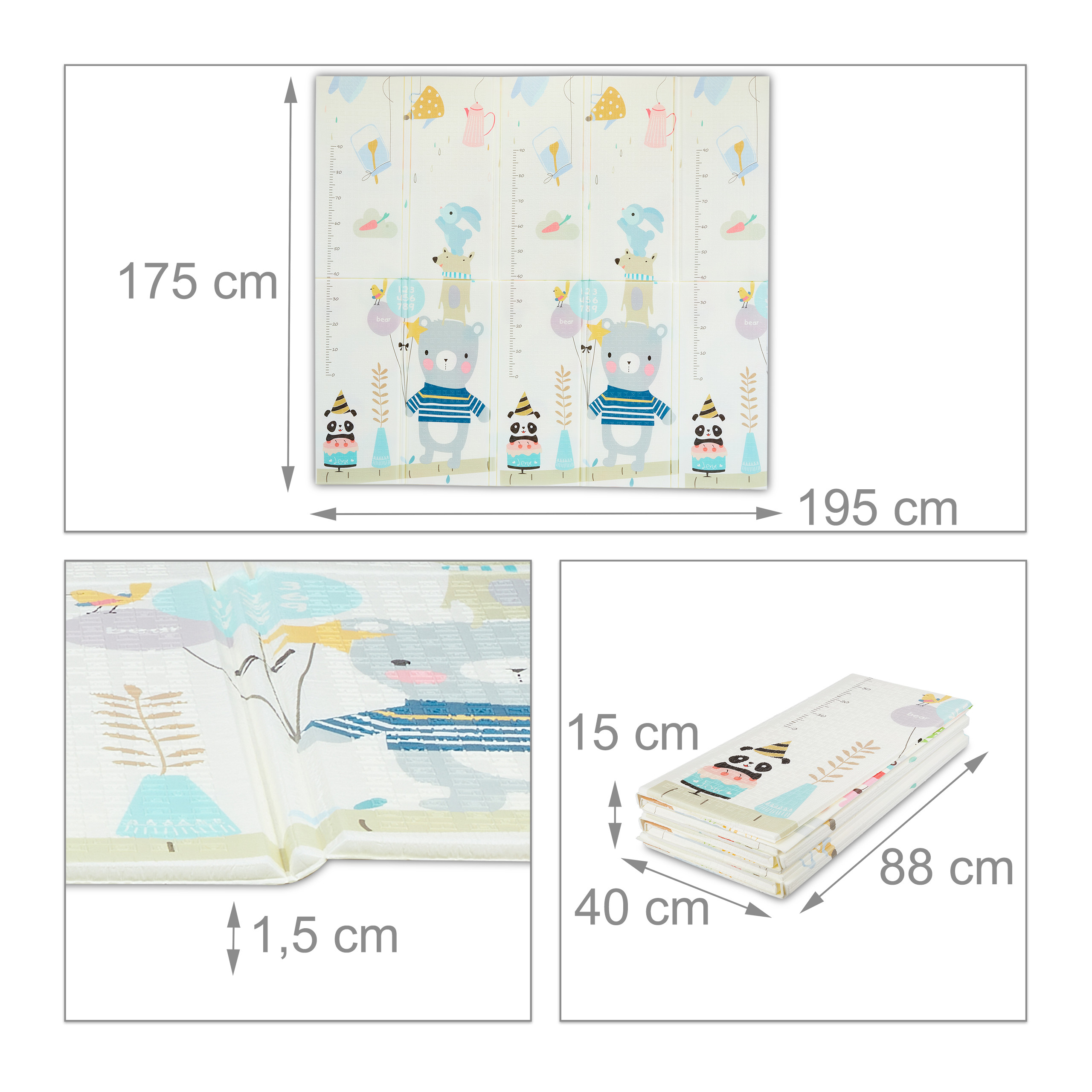 - Saugumas ir komfortas: Storas kilimėlis puikiai apsaugo nuo smūgių ir šaltos žemės, užtikrindamas vaikų saugumą ir komfortą.