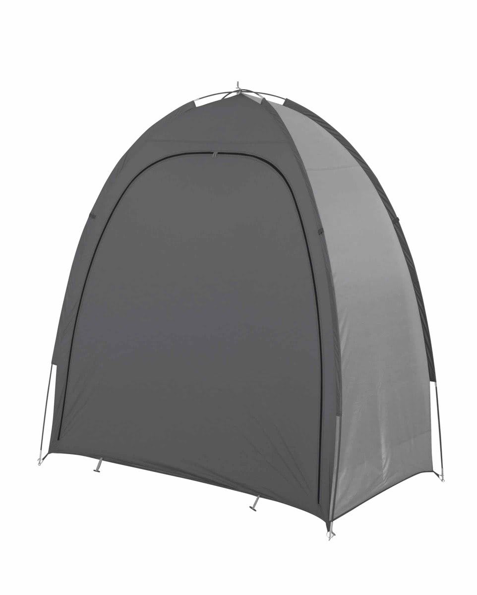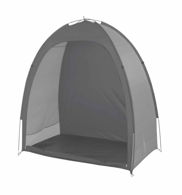 Kompaktiška palapinė dviračiams ar kitiems daiktams laikyti; daugiafunkcinis, lengvai montuojamas. Pagaminta iš patvaraus poliesterio, padengta vandeniui atsparia poliuretano danga (atspari vandeniui iki 1000 mm vandens stulpelio) su vandeniui atspariomis grindimis (vandeniui atspari iki 600 mm vandens stulpelio) Palapinės stiebai yra sukryžiuoti dėl papildomo stabilumo ir pagaminti iš 8,5 mm stiklo pluošto; stogo siūlės tvirtinamos juostele. Palapinė komplektuojama su: valais, kaiščiais ir transportavimo uždanga Matmenys: 185 (aukštis) x 180 x 85 cm Medžiaga: poliesteris