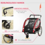 Dviračiu ar pėsčiomis – ši puiki HOMCOM vaikiška dviračio priekaba „du viename“ garantuoja saugią ir patogią kelionę jūsų mažiesiems! Vaikiškos priekabos didelės, oro pripildytos padangos užtikrina sklandų važiavimą net nelygiais keliais. Tvirtas plieninis dviračio priekabos rėmas optimaliai apsaugo keleivius, o patvarus, susukamas dangtis – nuo vėjo ir oro. Be to, integruotos kišenės suteikia pakankamai vietos užkandžiams, gėrimams ir žaislams.