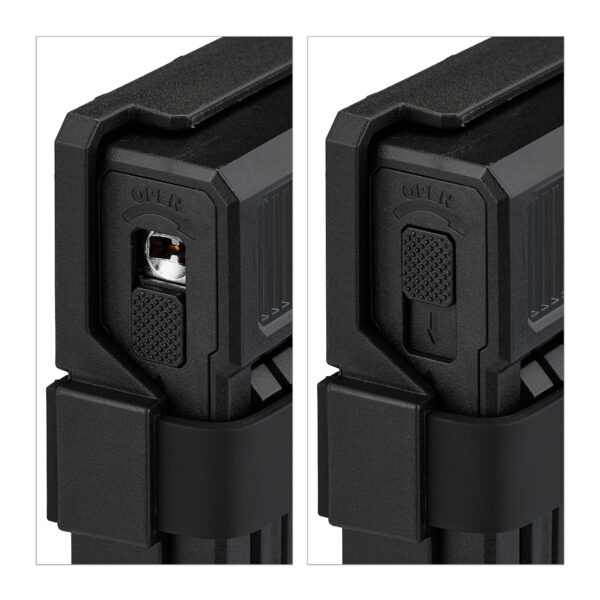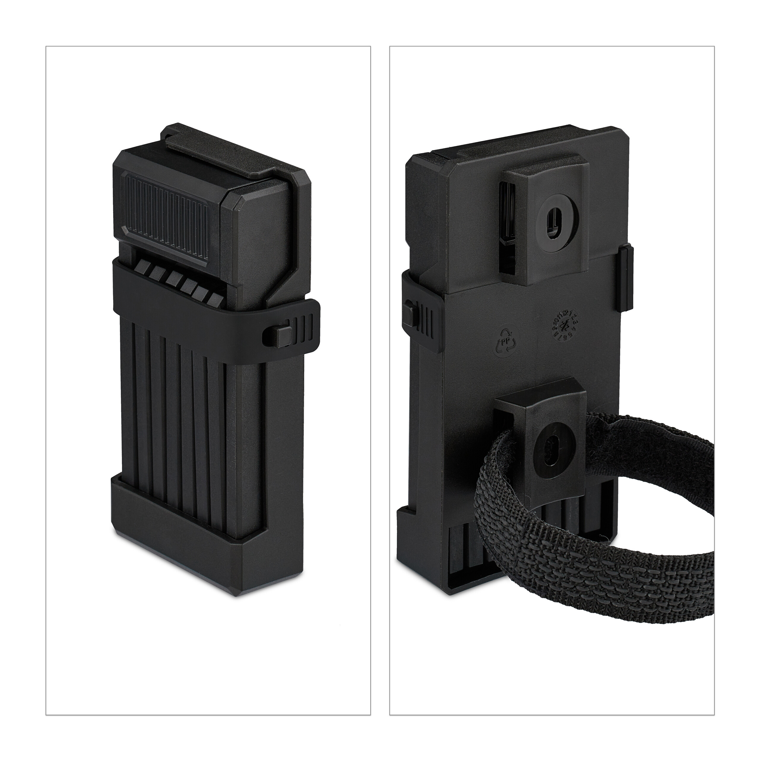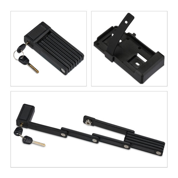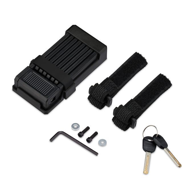 - Rėmo laikiklis: Pridedamas laikiklis leidžia patogiai pritvirtinti spyną prie dviračio rėmo naudojant varžtus arba Velcro užsegimus.