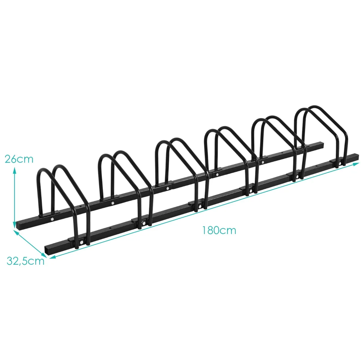 Dviračių stovas 180×32,5x26cm, juodos spalvos, skirtas šešių dviračių tvarkingam laikymui tiek patalpose, tiek lauke. Jis pagamintas iš plieno, todėl yra patvarus ir patogus naudoti įvairiose aplinkose. Kompaktiškas dydis užtikrina lengvą transportavimą ir laikymą.