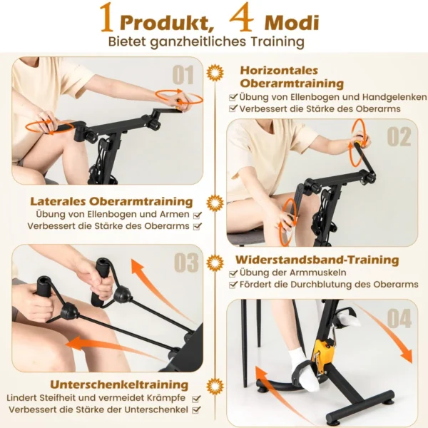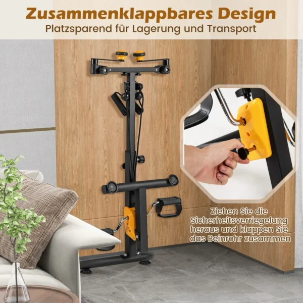 Dviratis treniruoklis 53x43x102 cm, juodos spalvos, skirtas viso kūno treniruotei namuose. Šis treniruoklis padeda stiprinti viršutinę ir apatinę kūno dalį, tinka įvairaus amžiaus žmonėms bei reabilitacijos procesams. Reguliuojamas aukštis ir pasipriešinimas užtikrina patogų naudojimą pagal individualius poreikius.