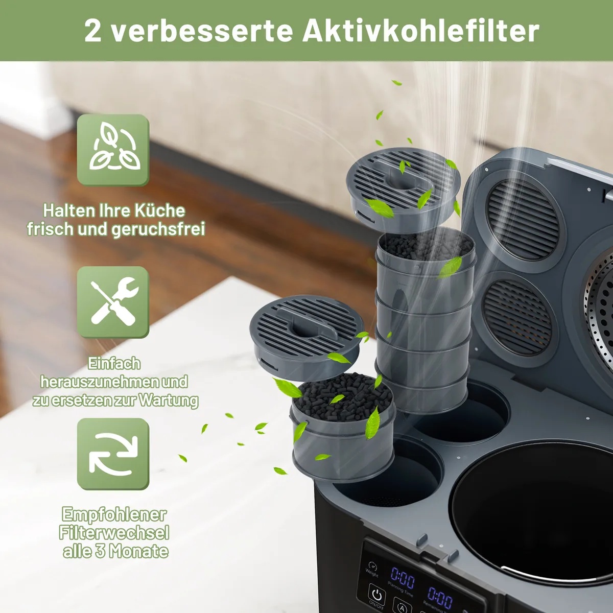 - Pažangūs aktyvintos anglies filtrai su lengvu keitimu ir kvapų kontrole.