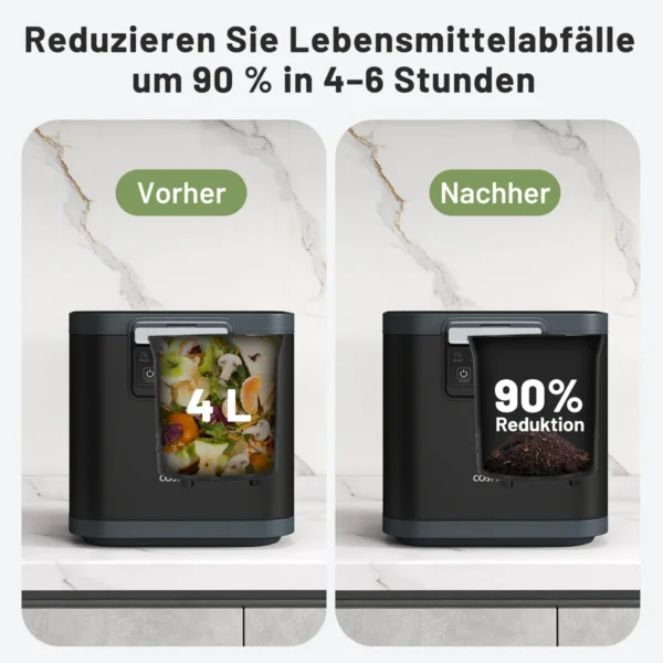 Elektrinis komposterinis 33,5x26x34cm, juodos spalvos, skirtas efektyviam virtuvės atliekų perdirbimui. Šis 4 l talpos elektrinis komposteris sumažina maisto švaistymą iki 90 % per 4-6 valandas, užtikrindamas kvapų kontrolę naudojant aktyvintos anglies filtrus. Tinkamas tvariam atliekų tvarkymui bei maistingų trąšų gamybai.