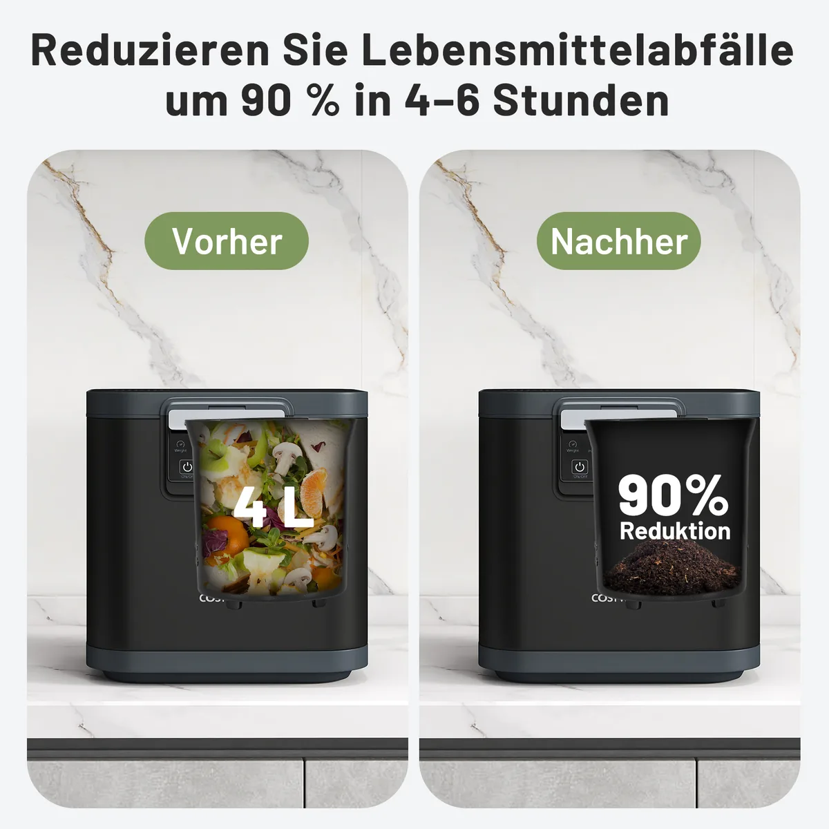 - Didelės talpos (4 l) dėžė sumažina maisto atliekas 90 % per 4-6 valandas.