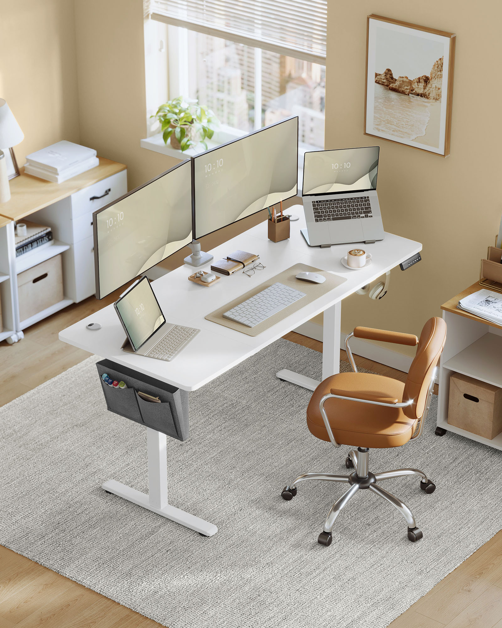 Šis stalas leidžia lengvai reguliuoti aukštį, todėl galite dirbti tiek sėdėdami, tiek stovėdami, prisitaikydami prie savo poreikių ir užtikrindami ergonomišką darbo aplinką. Tvirtas plieninis rėmas ir kokybiškos medžiagos garantuoja stabilumą ir patikimumą, o debesų baltos spalvos paviršius suteikia šiuolaikišką ir estetišką išvaizdą.