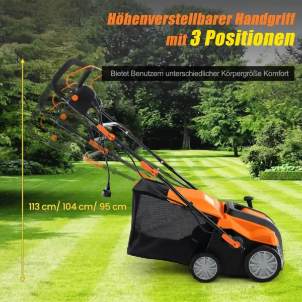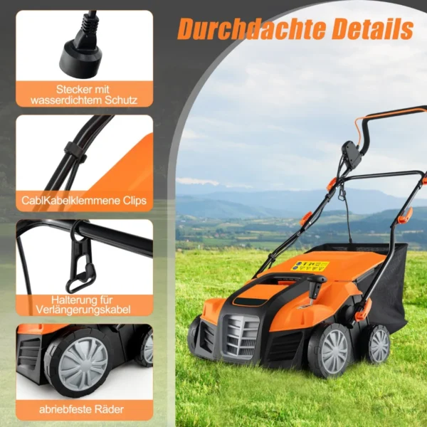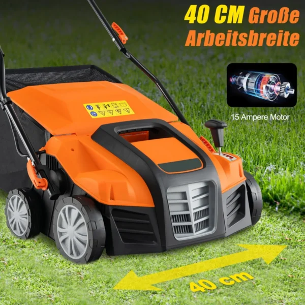 Elektrinis skarifikatorius 109x64x113 cm oranžinės ir juodos spalvos yra efektyvus įrankis vejai prižiūrėti. Su 41 cm pjovimo pločiu ir galingu varikliu jis pagerina vejos būklę, pašalindamas samanas ir purenant dirvą. Kompaktiškas, sulankstomas dizainas užtikrina patogų laikymą bei paprastą naudojimą.