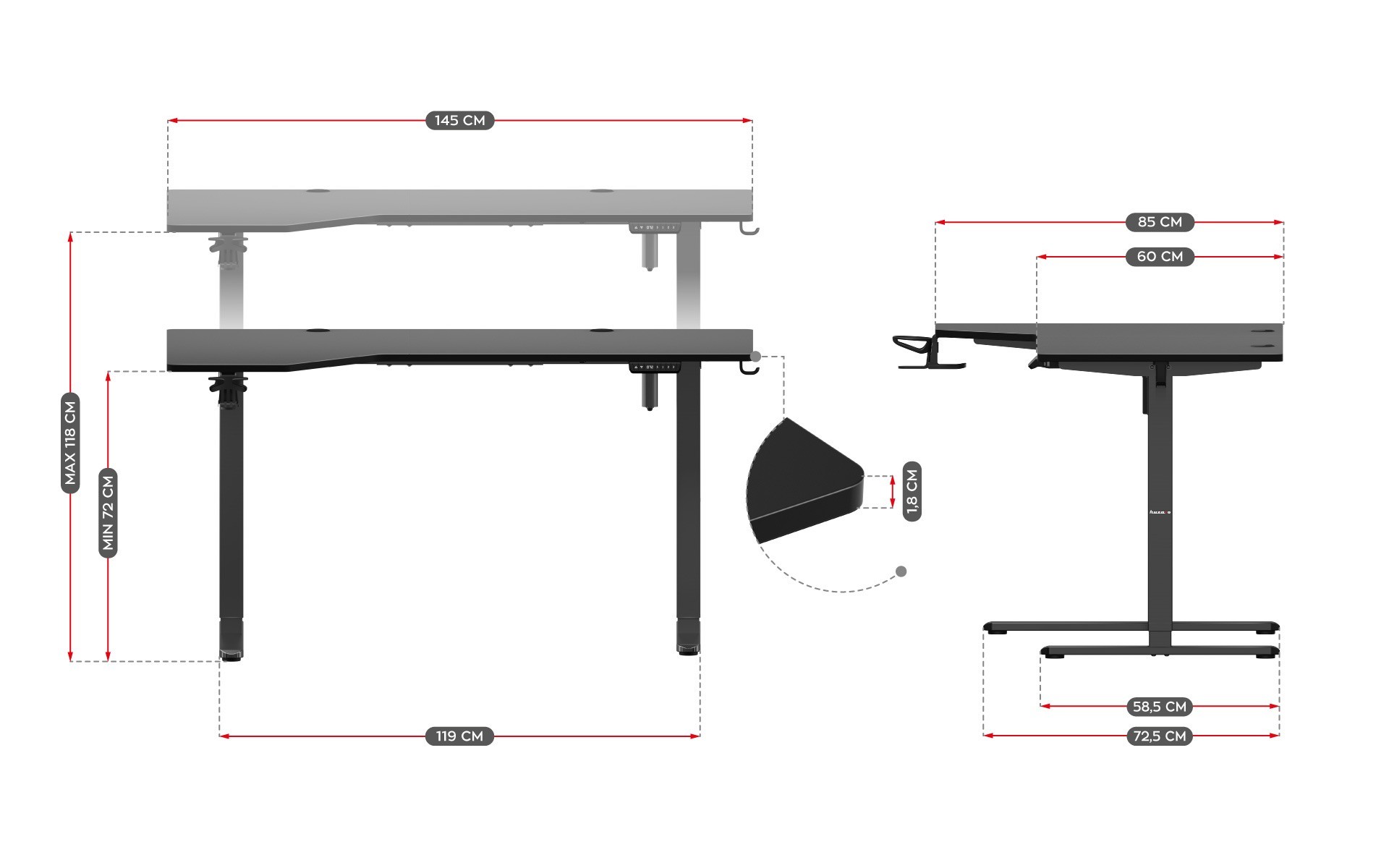 Elektrinis aukščio reguliavimas: stalviršio aukštis nuo 72 iki 120 cm