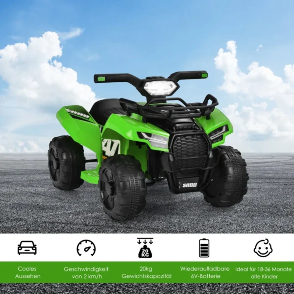Elektrinis vaikiškas keturratis 44x66x42cm, žalios ir juodos spalvos, skirtas vaikams nuo 18 iki 36 mėnesių. Šis keturratis leidžia vaikams saugiai mėgautis važiavimu su pastoviu 2 km/h greičiu. Komplektuojamas su įkraunama baterija ir USB/MP3 prievadais papildomai pramogai.