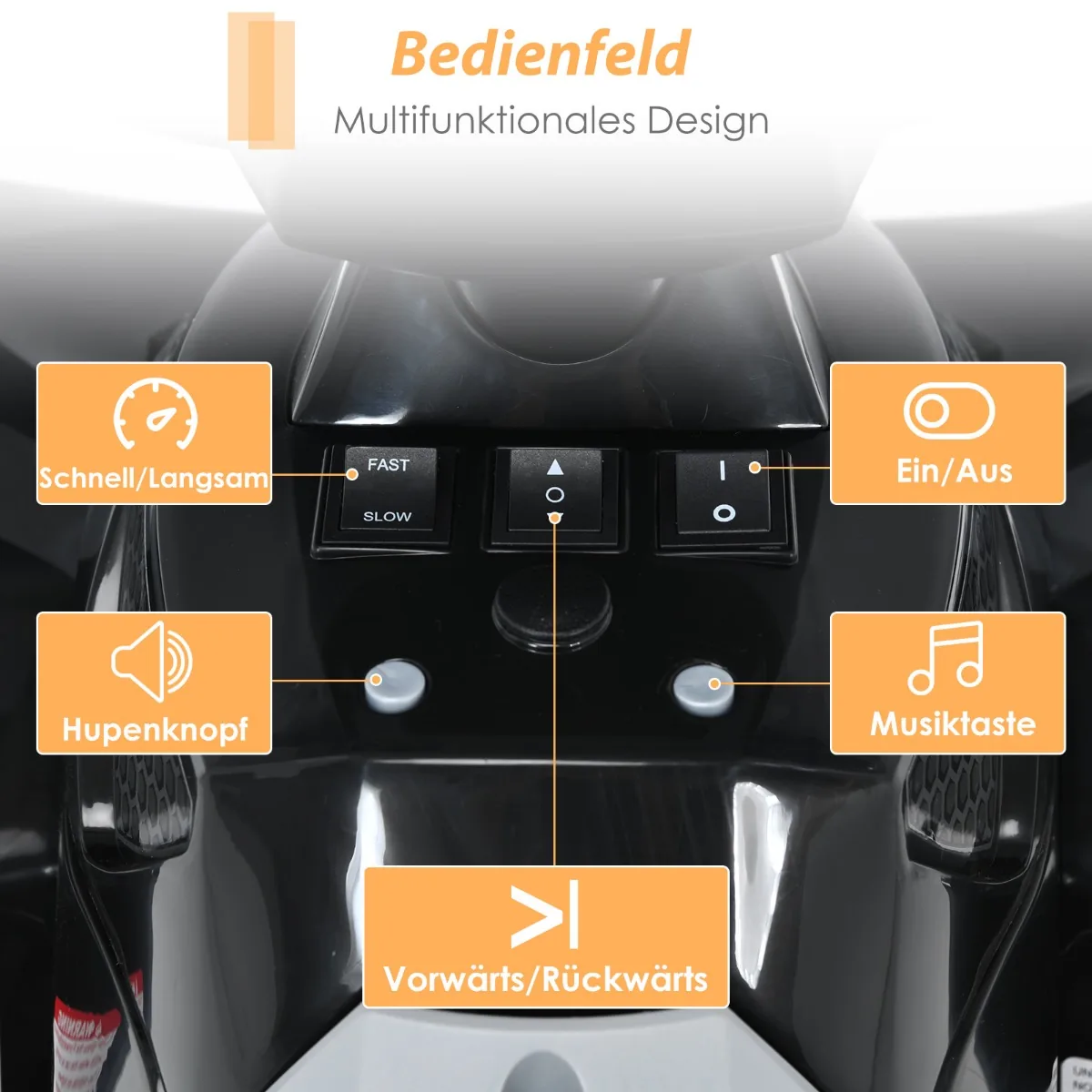 - Valdymo skydelis leidžia reguliuoti greitį, įjungti muziką, garso signalą ir LED žibintus