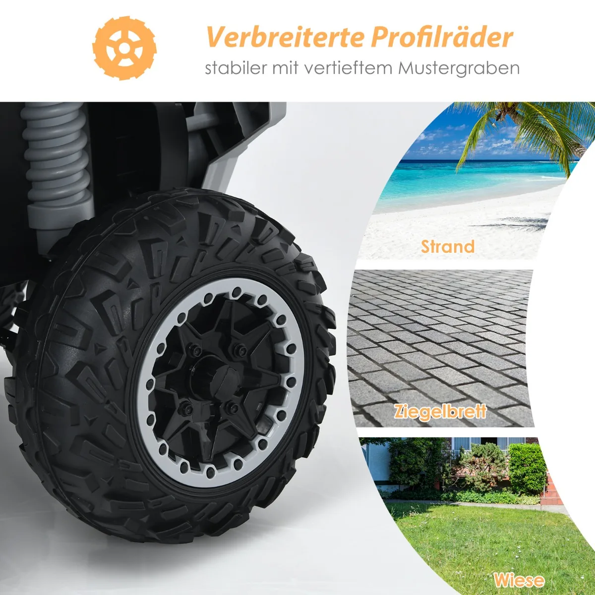 - Tvirti 28 cm skersmens ratai tinka važiuoti ant kelių, žolės ir smėlio