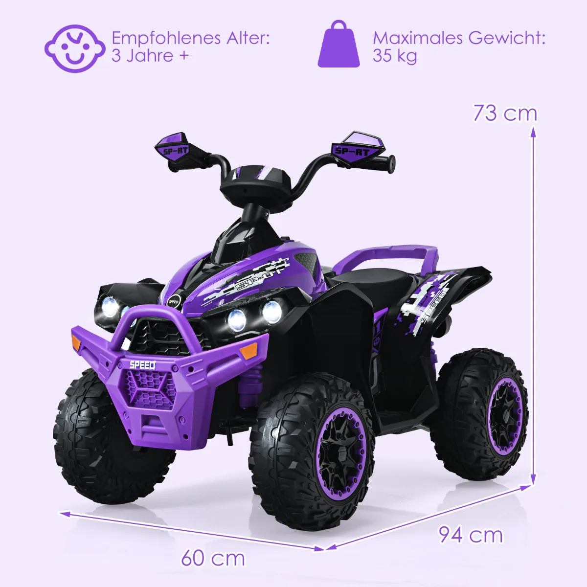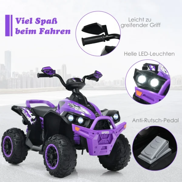 Elektrinis vaikiškas keturratis yra puikus pasirinkimas vaikams nuo 3 iki 8 metų, norintiems saugiai ir smagiai leisti laiką tiek lauke, tiek patalpose. Violetinės ir juodos spalvų transporto priemonė pasižymi patvaria konstrukcija bei ergonomišku valdymu, leidžiančiu sklandžiai reguliuoti greitį bei garsus.
