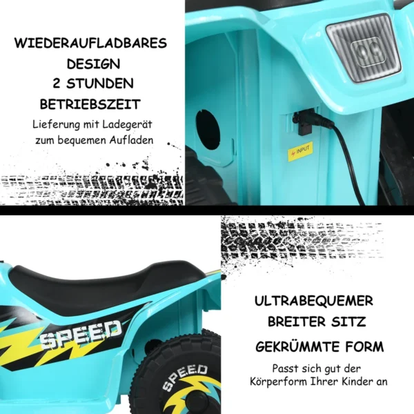 Elektrinis vaikiškas keturratis 73x40x44,5 cm, mėlynos ir juodos spalvos, puikiai tinka vaikų laisvalaikiui tiek lauke, tiek patalpose. Ši transporto priemonė varoma akumuliatoriumi, leidžia važiuoti pirmyn ir atgal, užtikrina stabilumą bei patogumą vaikams nuo 3 metų.