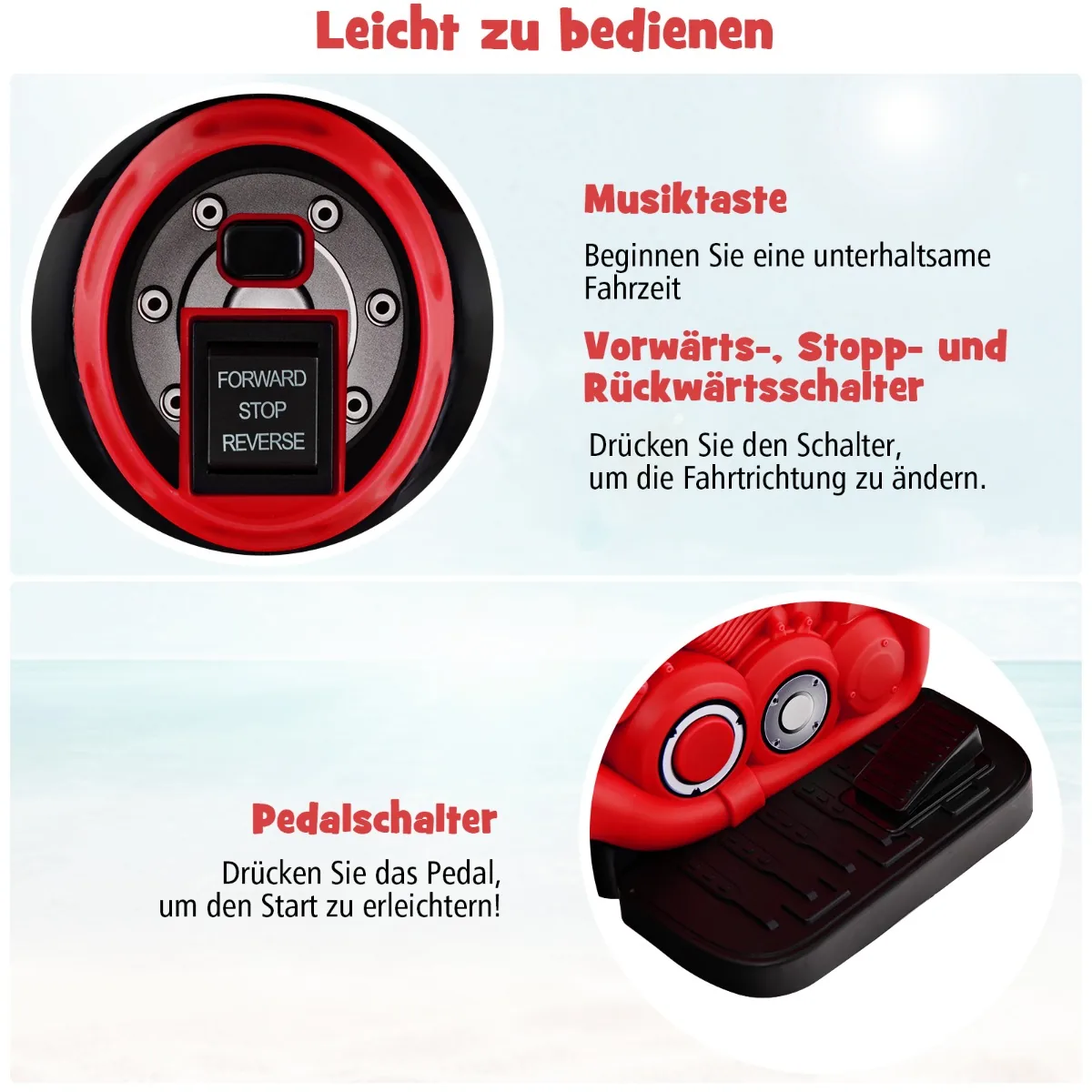 - Valdymas paprastas: pedalą paspaudus pradeda važiuoti, o mechaninis jungiklis leidžia keisti kryptį.