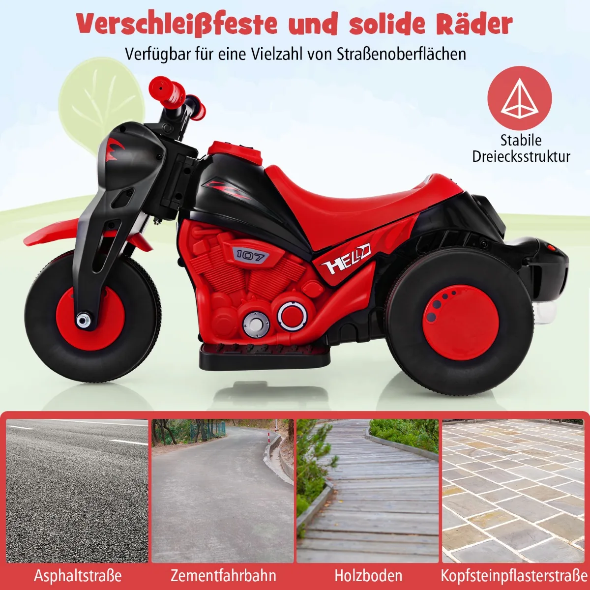 Elektrinis vaikiškas motociklas 81x36x43 cm, juodos ir raudonos spalvos, puikiai tinka vaikų pramogoms lauke ar namuose. Šis vaikiškas elektrinis motociklas turi burbulų funkciją, muzikos mygtuką ir LED priekius žibintus, užtikrinančius saugumą ir ilgesnį žaidimą.