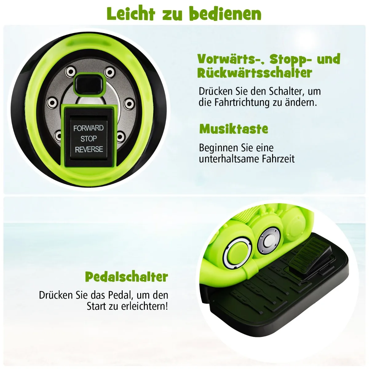 - Įrengtas muzikos jungiklis ir apšviesti LED priekiniai žibintai, gerinantys žaidimo kokybę ir saugumą.
