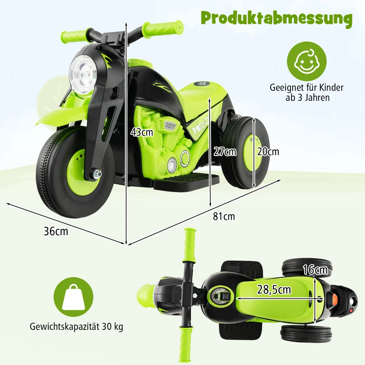 Elektrinis vaikiškas motociklas 81x36x43 cm, juodos ir žalios spalvų, skirtas vaikams, kurie mėgsta aktyvų laisvalaikį ir linksmą važinėjimąsi. Šis elektrinis motociklas pasižymi burbulų funkcija, LED priekiniais žibintais ir muzikos mygtuku, užtikrinančiais papildomą pramogą vaikams.