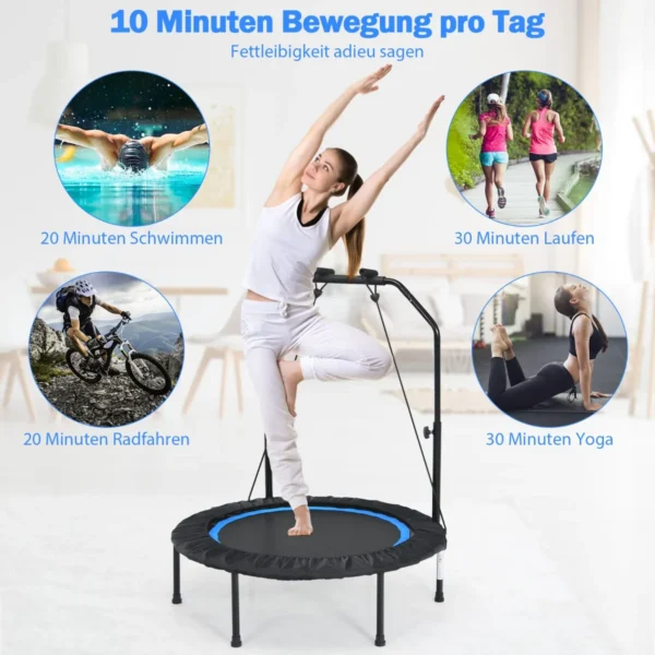 Fitneso batutas 101×130,5cm juodos ir mėlynos spalvų derinyje – praktiškas pasirinkimas tiek vaikams, tiek suaugusiems aktyvioms treniruotėms namuose ar lauke. Batutas su reguliuojama rankena ir atsparumo juostomis leidžia atlikti įvairius pratimus, tokius kaip šuoliai, tempimas, joga ar pritūpimai.