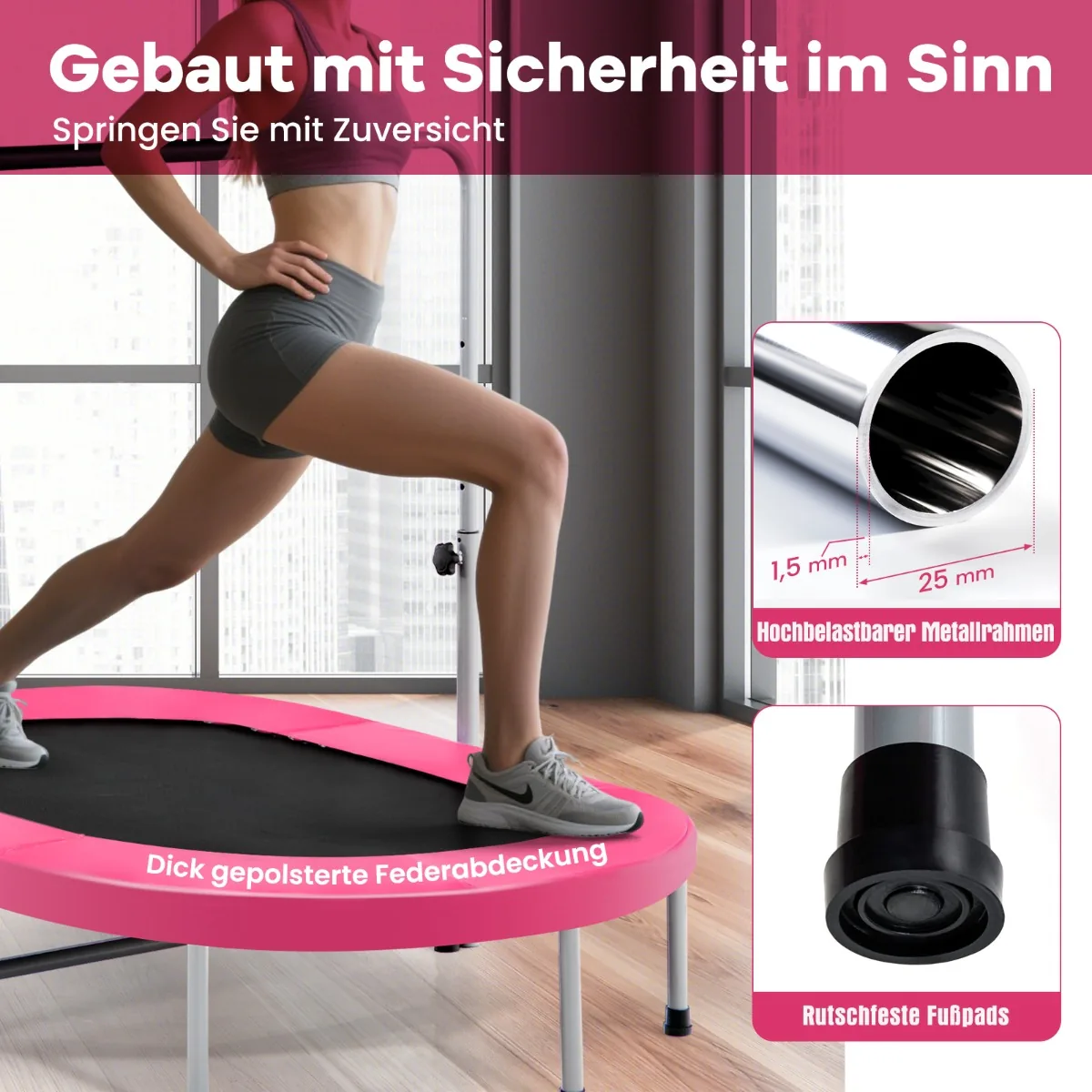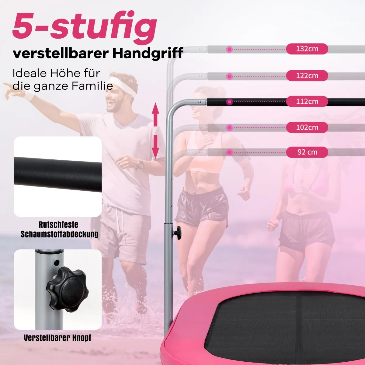 - Reguliuojama rankena (92–132 cm aukščio) su putplasčiu paminkštinimu užtikrina komfortą šokinėjant.