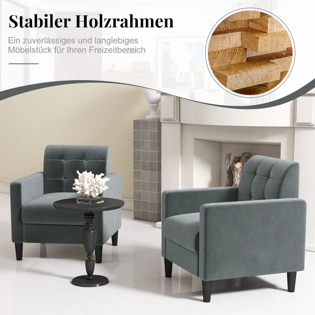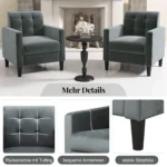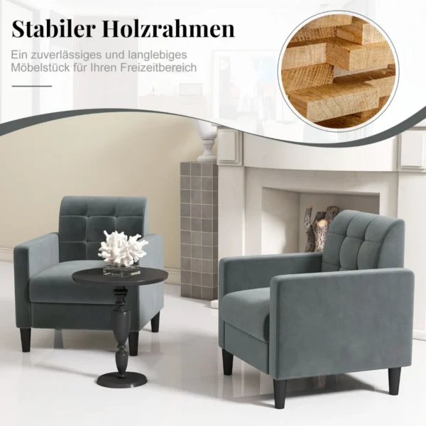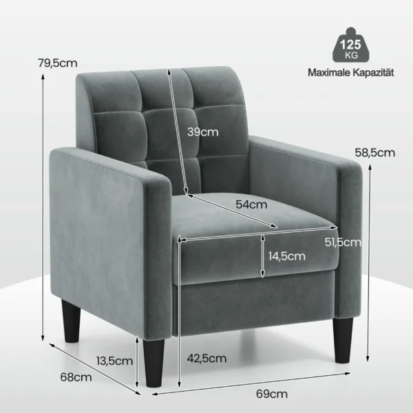 Fotelis 69x68x79,5 cm, tamsiai pilkos ir juodos spalvos, puikiai tinka svetainėms, skaitykloms ar darbo kambariams. Aksominis audinys ir tvirtas medinis rėmas suteikia patogumo bei ilgaamžiškumo, o ergonomiškas dizainas užtikrina komfortišką sėdėjimą.