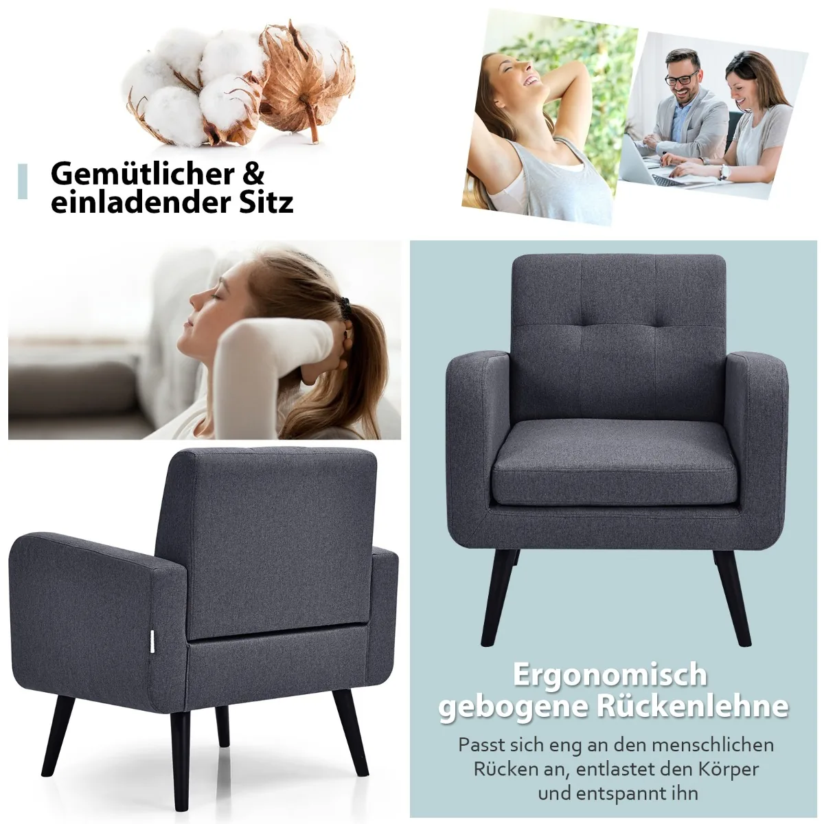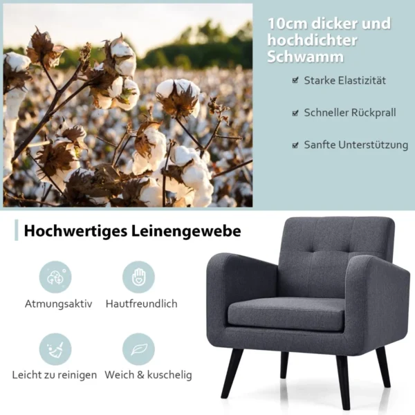 - Fotelis pagamintas iš medinio rėmo su guminėmis kojomis, užtikrinančiomis stabilumą ir ilgaamžiškumą.