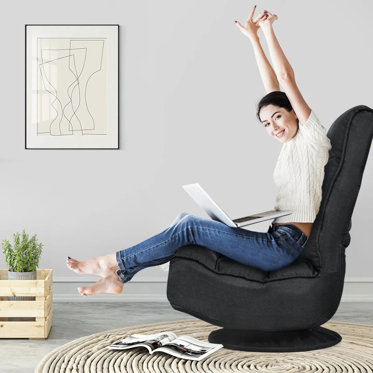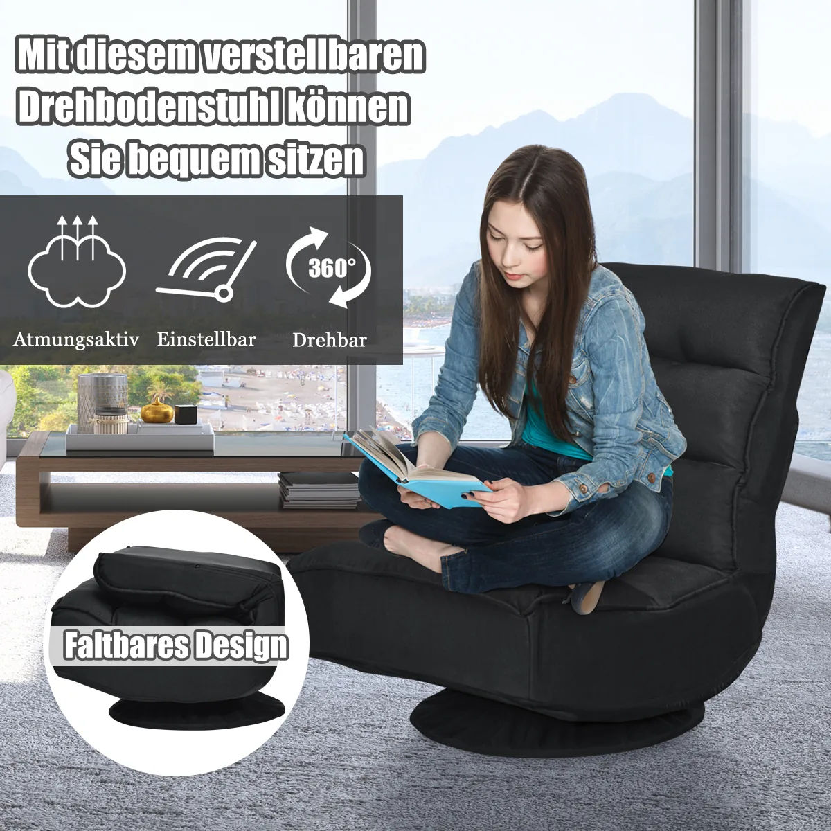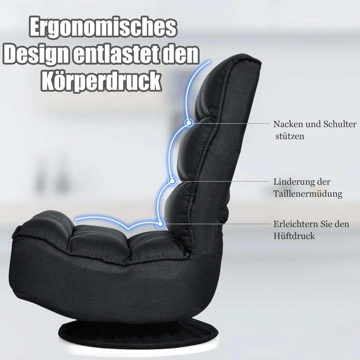 - Reguliuojama grindų kėdė su tankiu paminkštinimu ir minkštu, kvėpuojančiu audiniu.