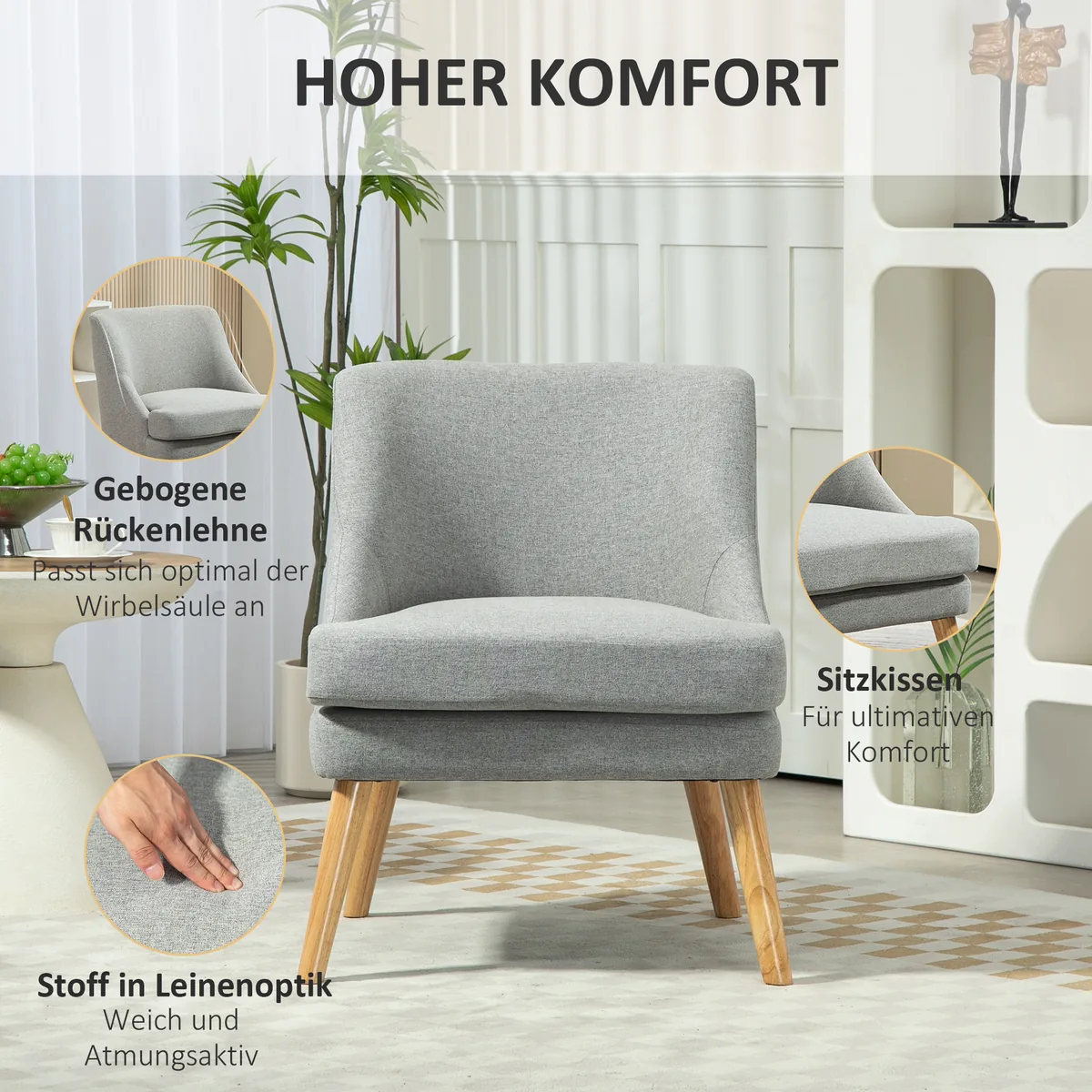 Leiskite save sužavėti šio išskirtinio fotelio skandinaviško žavesio. Dėl gilios, žemos sėdynės ir ergonomiškos formos atlošo jis užtikrina maksimalų komfortą. Plona minkštos kėdės konstrukcija ir smailėjančios kojos iš tvirtos gumos, didelio tankio putplasčio paminkštinimas ir 100 % poliesterio lino išvaizdos užvalkalas užtikrina stilingą ir jaukią sėdėjimo patirtį. Puikiai tinka jūsų svetainei – bet kurių namų akcentas.