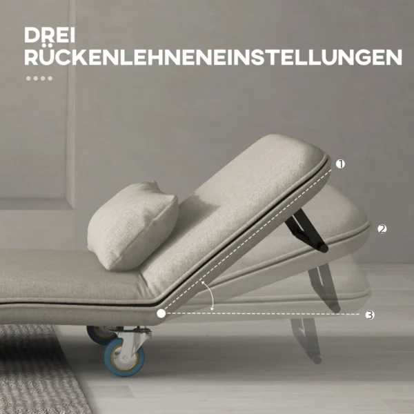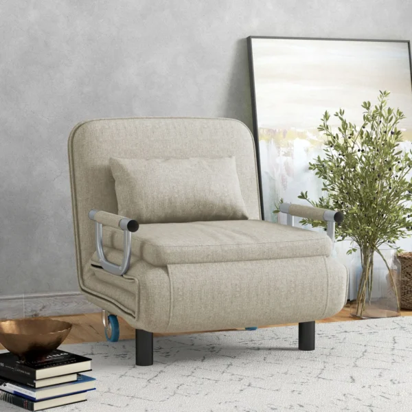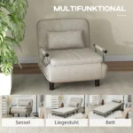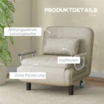 Su HOMCOM lovos kėde įnešite į savo namus maksimalų komfortą. Metalinis sofos rėmas yra tvirtas ir patvarus, o atlošą galima reguliuoti trimis lygiais. Į liną panašus miegamojo kėdės užvalkalas, užpildytas storu putplasčiu, užtikrina aukštą komforto lygį. Lengvas pakeitimas į viengulę lovą leidžia svečiui pasiūlyti lanksčią miegojimo vietą.