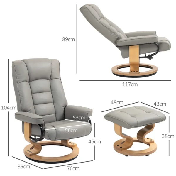 Atsipalaiduokite stilingai su atsipalaidavimo kėde su taburete iš HOMCOM – jūsų naujojo partnerių dueto, kad galėtumėte atsipalaiduoti! Atsiloškite iki 130° ir mėgaukitės 360° besisukančio pagrindo judėjimo laisve ir siūbavimo funkcija. Pasilepinkite prabanga mūsų HOMCOM televizoriaus foteliu, aptrauktu elegantiška dirbtine oda ir įtaisytu į tvirtą rėmą, pagamintą iš lenktos medienos. Idealiai tinka svetainei arba kaip stilingas skaitymo kampelio papildymas.
