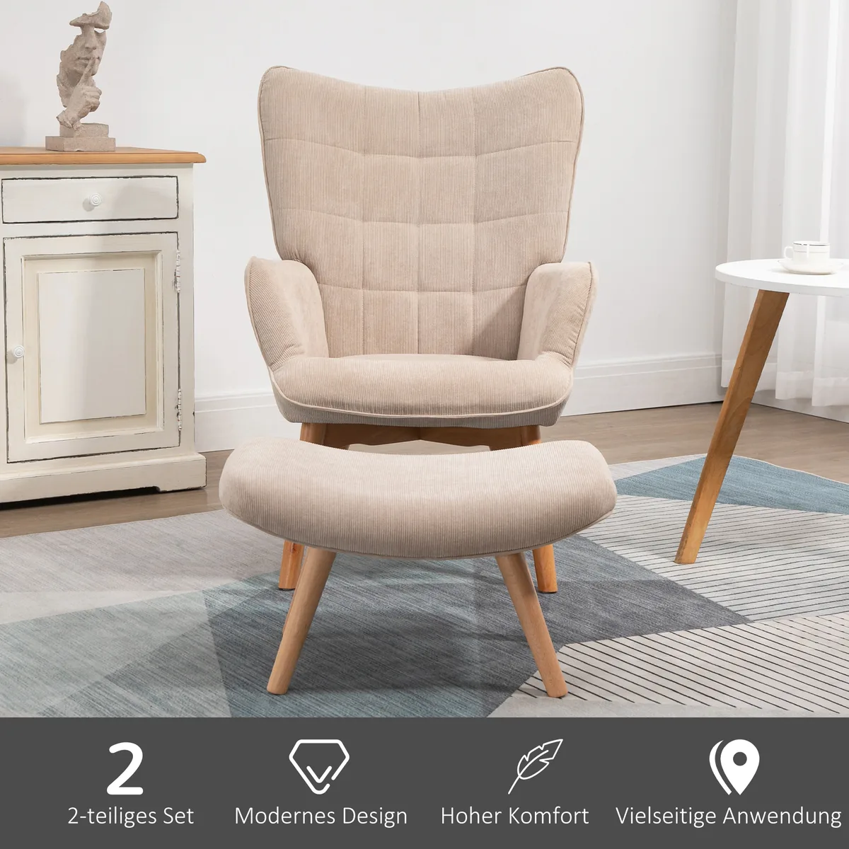Stilizuokite savo namus naudodami šį HOMCOM poilsio kėdžių ir pufų rinkinį. Storai paminkštinta sėdynė suteikia daug komforto, o kojas galite pasikelti ant papildomos taburetės. Šis fotelis yra graži ir patogi sėdynė skaityti knygą, ilsėtis su draugu ar tiesiog leisti laiką su savimi – su skaitymo kėdės komplektu ir taburete vakaras po darbo bus jaukus.