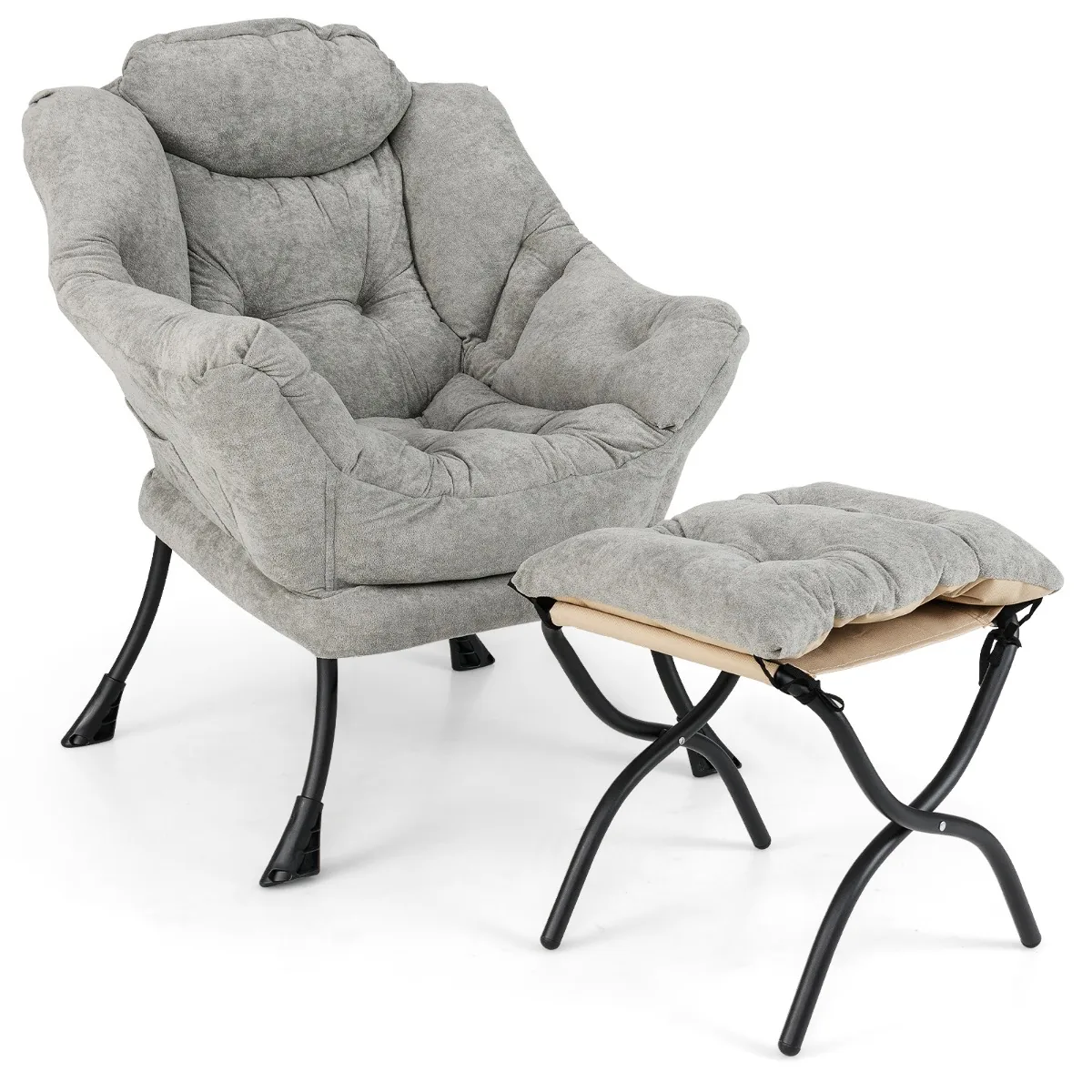Fotelis su pakoju pilkos/juodos spalvos yra patogi ir funkcionali poilsio kėdė, skirta atsipalaidavimui ir kasdieniam naudojimui. Komplektą sudaro minkštas fotelis su šerpa audiniu bei sulankstomas pufas, kuris gali būti naudojamas kaip pėdų atrama arba papildoma sėdima vieta. Dėl tvirtos konstrukcijos ir ergonomiško dizaino šis fotelis puikiai tinka tiek svetainėms, tiek miegamiesiems ar namų darbo zonoms.