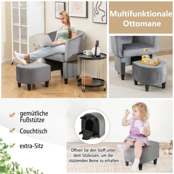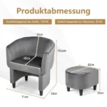 Fotelis su pakoju pilkos ir juodos spalvos puikiai tinka komfortiškam poilsiui namuose ar biure. Komplektą sudaro ergonimiška kėdė su lenktu atlošu ir paminkštinta sėdima dalimi bei universalus pufas kojoms ar papildoma sėdima vieta.
