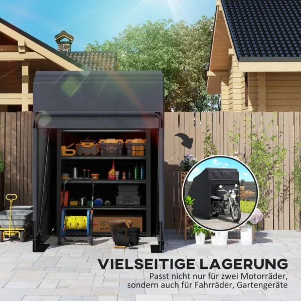 - ✔ Atsparus rūdims, atsparus įtrūkimams metalinis rėmas su motociklo paviršiumi garažas pagerina oro cirkuliaciją, apsaugo nuo kvapų ir drėgmės susilaikymo