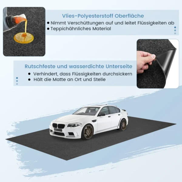 Garažo kilimėlis 800×220 cm tamsiai pilkos spalvos skirtas apsaugoti jūsų garažo grindis nuo alyvos, aušinimo skysčio ir kitų skysčių dėmių. Kilimėlis pagamintas iš neaustinio poliesterio su vandeniui atspariu ir neslystančiu LDPE pagrindu, todėl lengvai valomas ir patvarus.