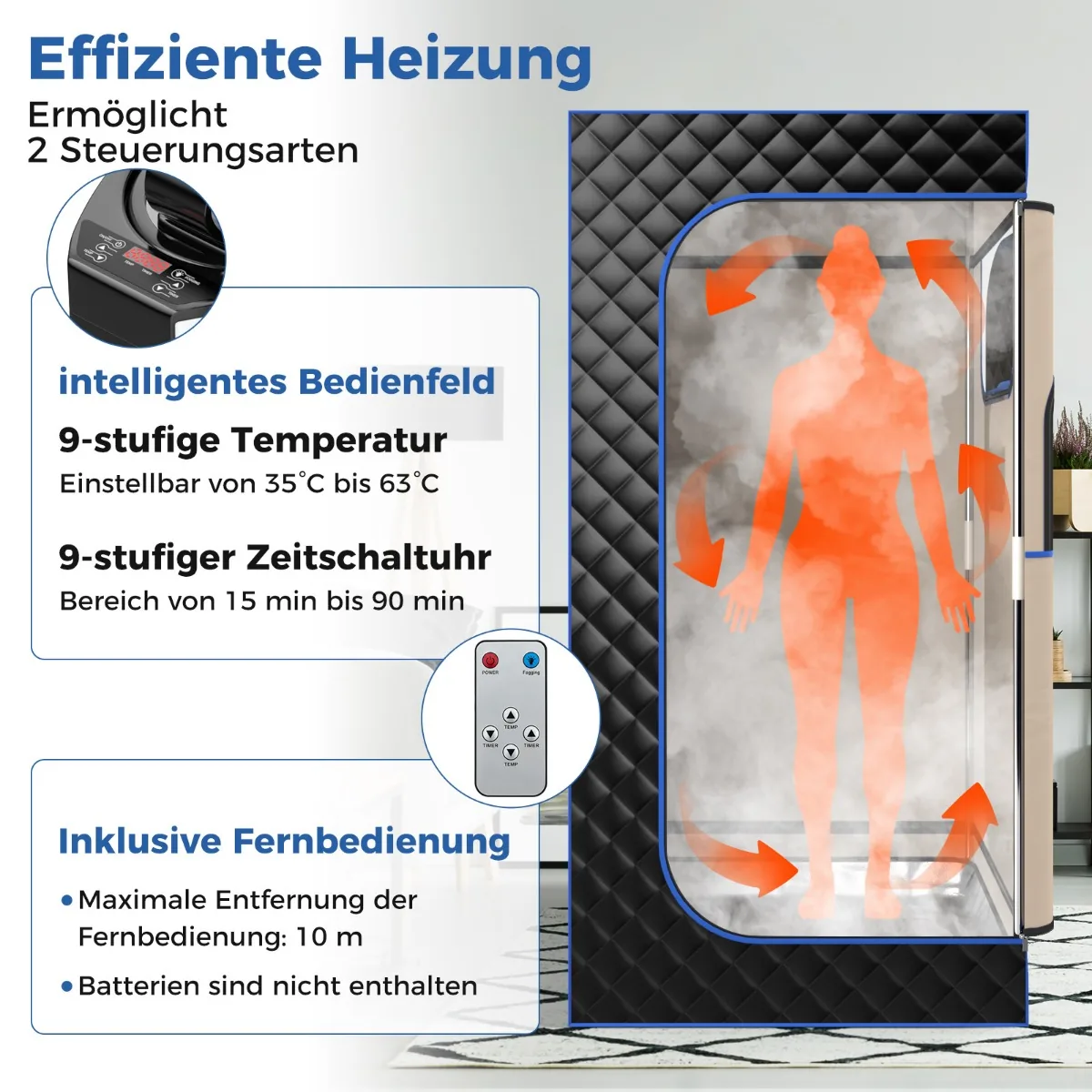 Garinė pirtis 91x91x183cm, juodos spalvos, suteikia efektyvią ir saugią namų pirties patirtį. Komplekte esantis 3 litrų garų generatorius su nerūdijančio plieno vidiniu indu leidžia reguliuoti temperatūrą nuo 35°C iki 63°C ir pritaikyti terapinius garus su papildomais ingredientais. Pirties palapinės konstrukcija užtikrina patogų naudojimą, gerą oro cirkuliaciją ir papildomą komfortą.