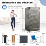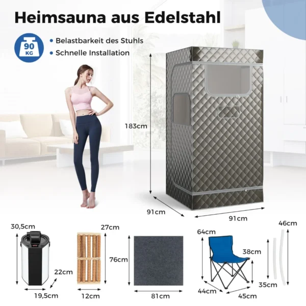 Garinė pirtis 91x91x183cm pilkos spalvos yra efektyvus sprendimas namų pirties sesijoms. Ši pirties palapinė sukurta patogiam temperatūros valdymui ir saugiam naudojimui, užtikrinant gerą oro cirkuliaciją bei pridėtinę vertę su komplekte esančiais priedais.