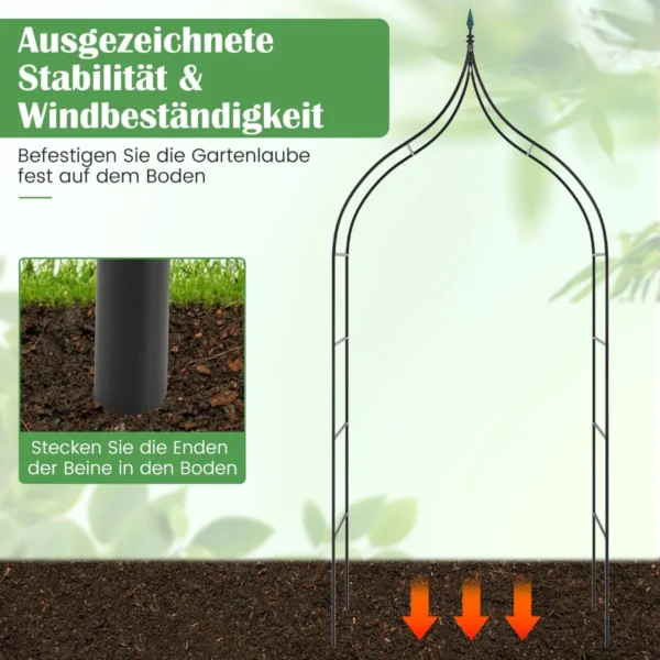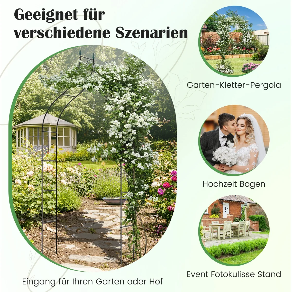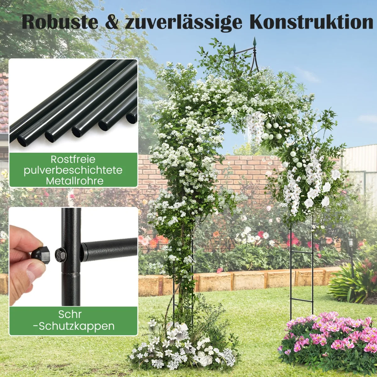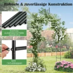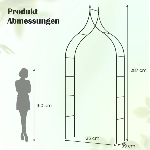 Gėlių arka 125x39x287 cm, juodos spalvos, skirta vijokliniams augalams auginti ir dekoratyvinėms sodų erdvėms kurti. Tinka įvairioms lauko dekoracijoms, įskaitant vestuves, gimtadienius ar renginius. Metalinė konstrukcija užtikrina tvirtumą ir atsparumą aplinkos poveikiui.